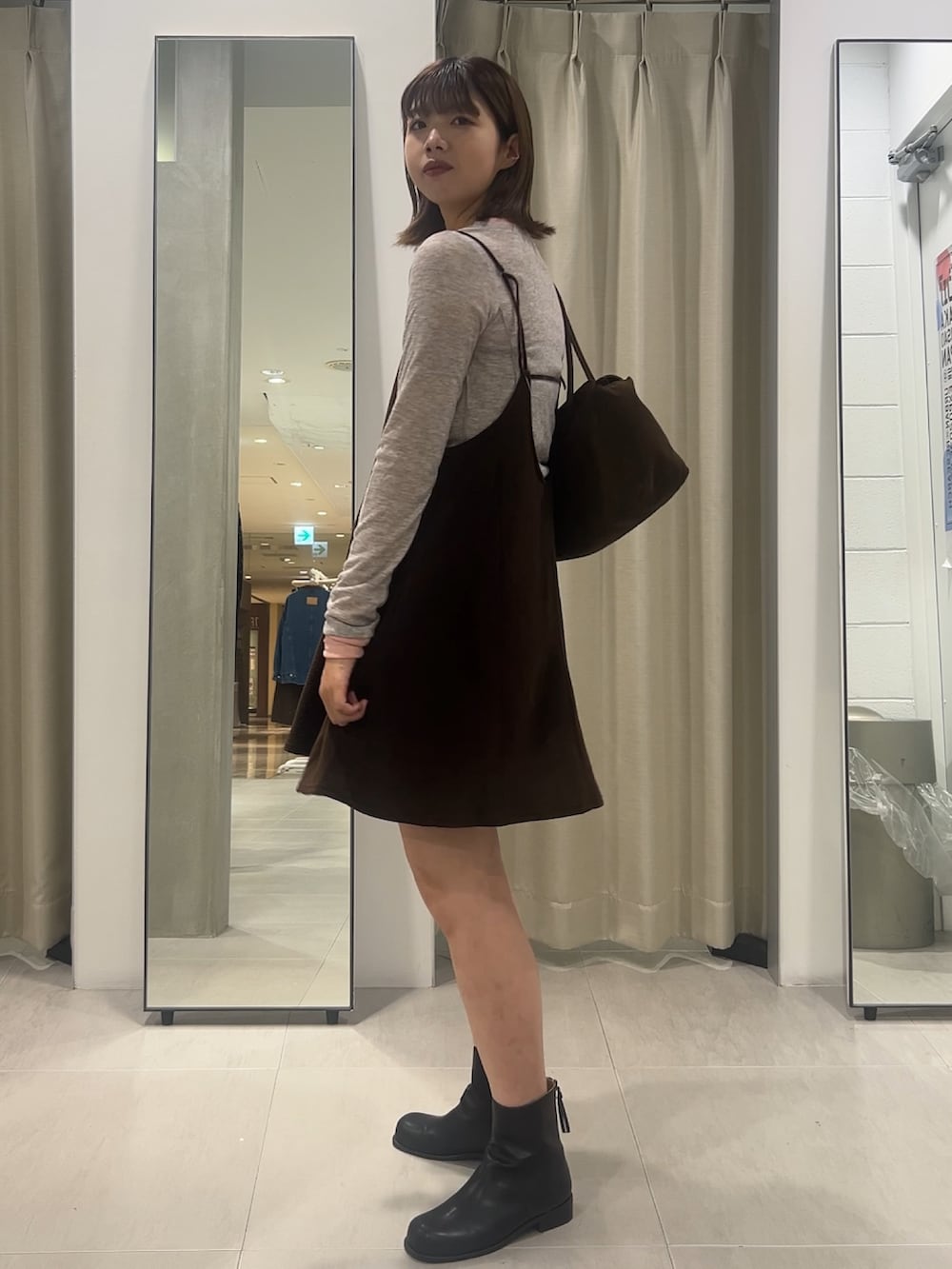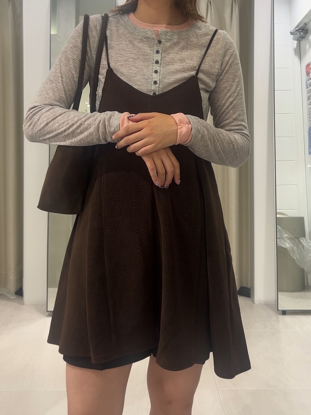 ピンクとグレーのレイヤードが可愛いカットソーと形が綺麗なミニワンピースのコーデ!
