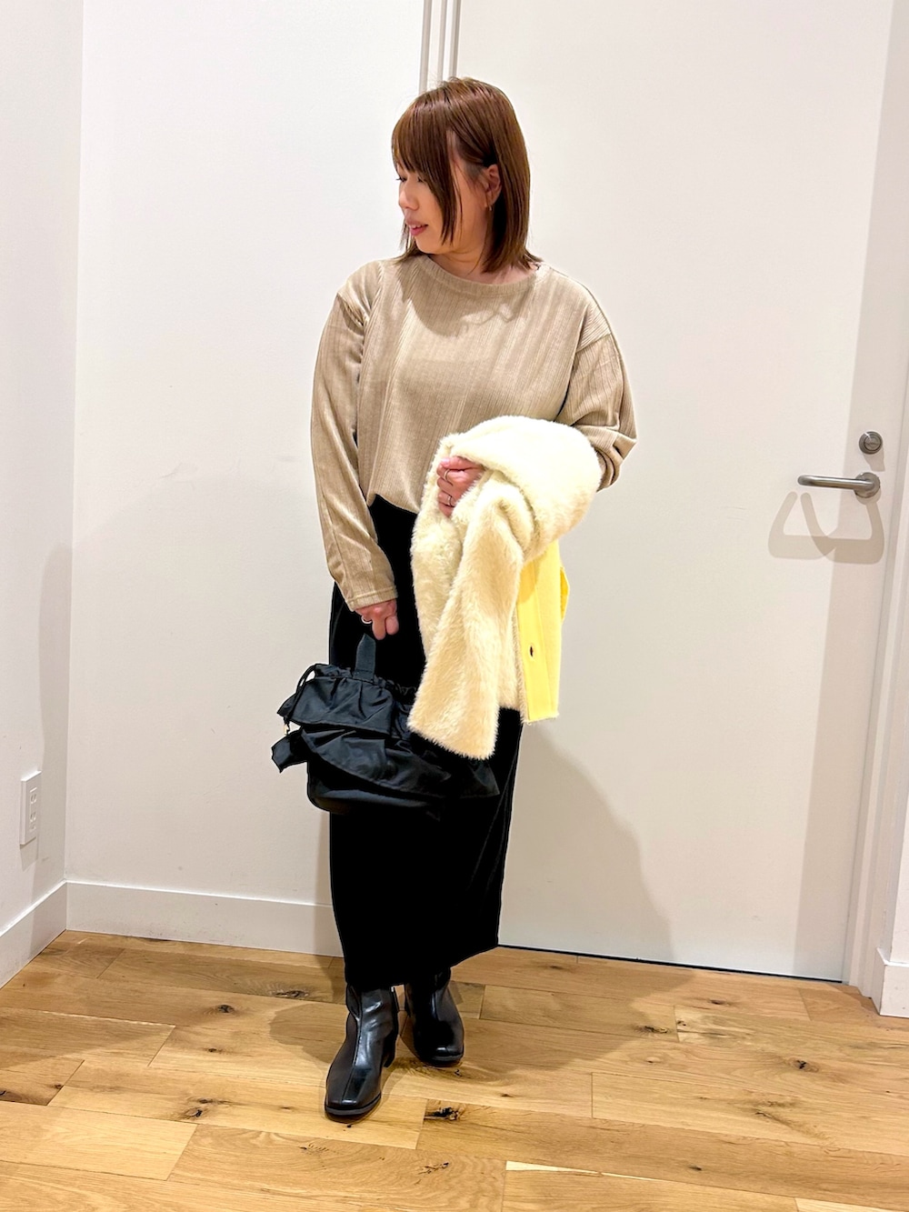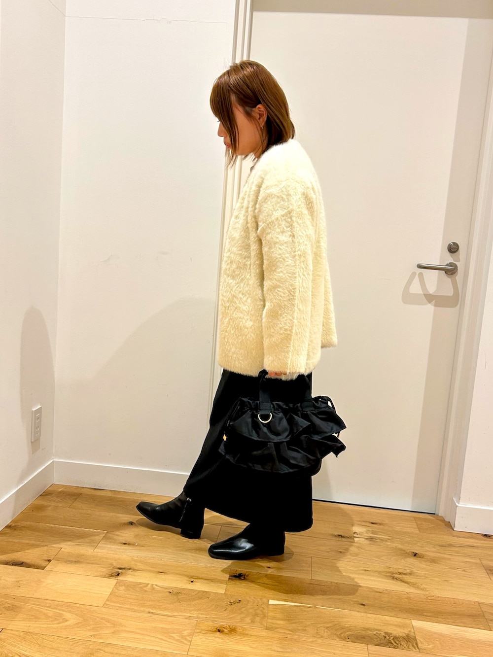 甘くなりすぎないよう黒のタイトスカートとバッグで合わせました。