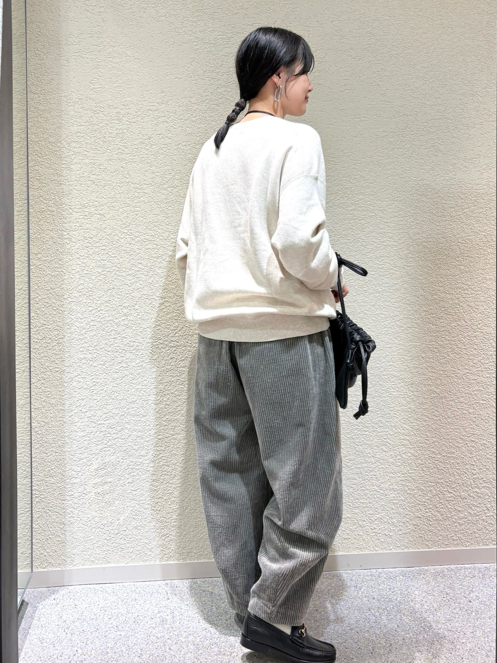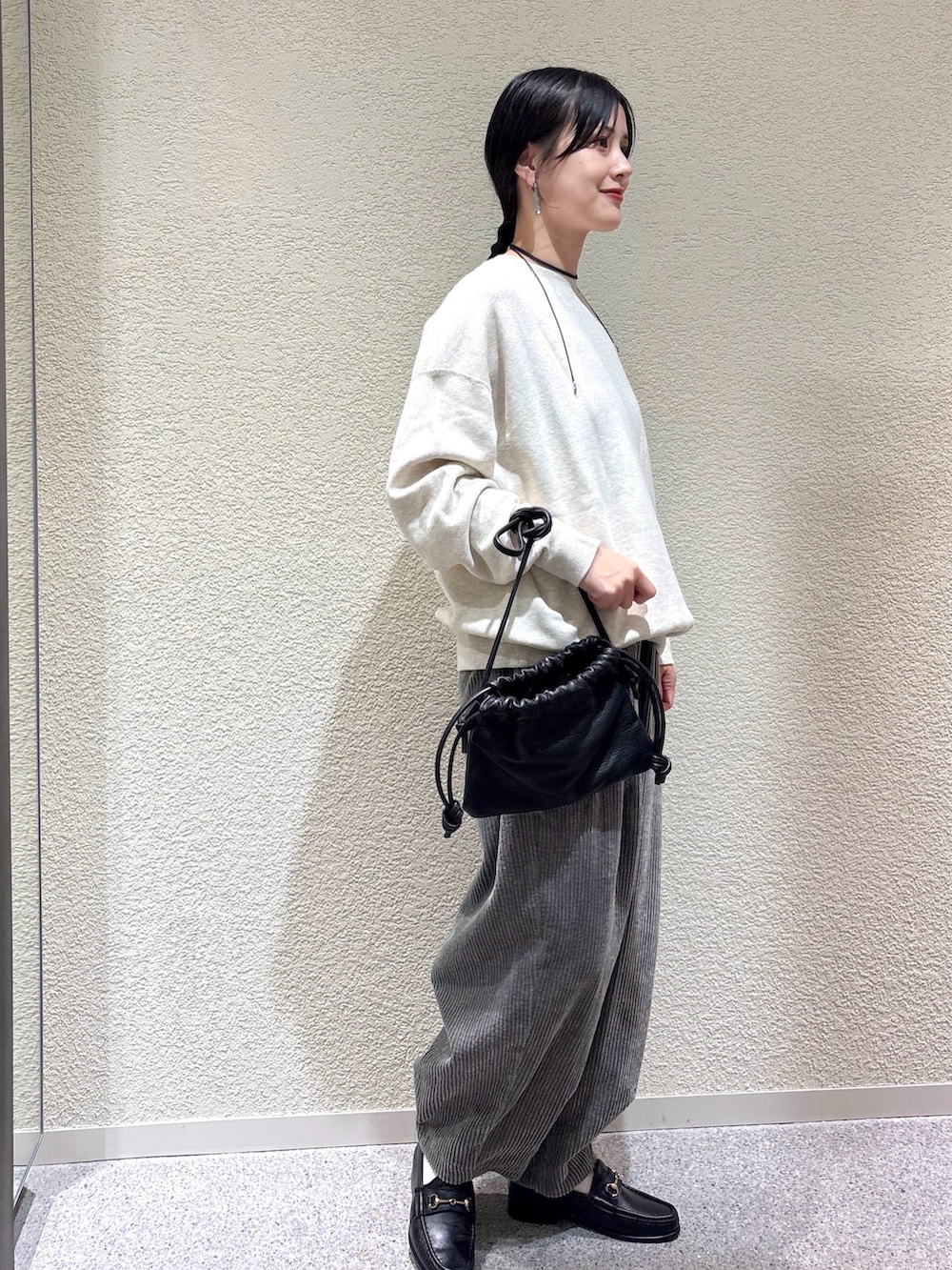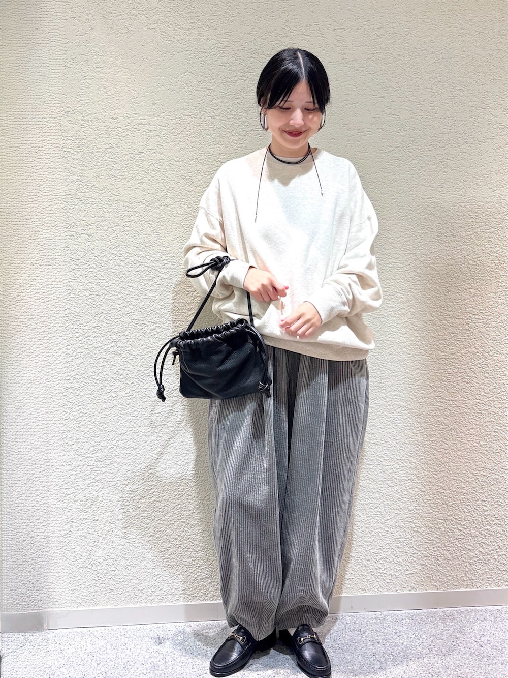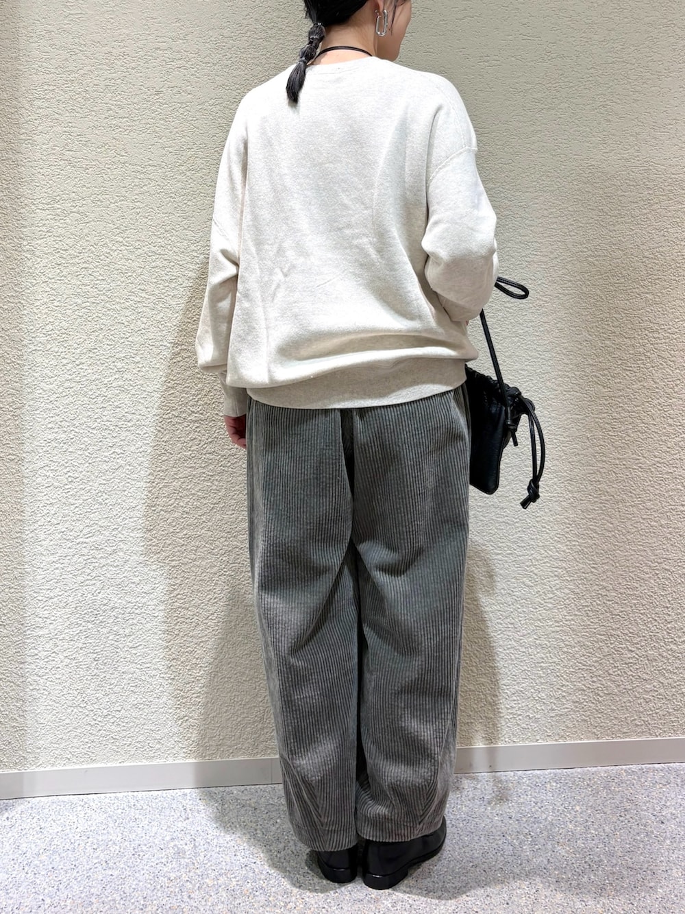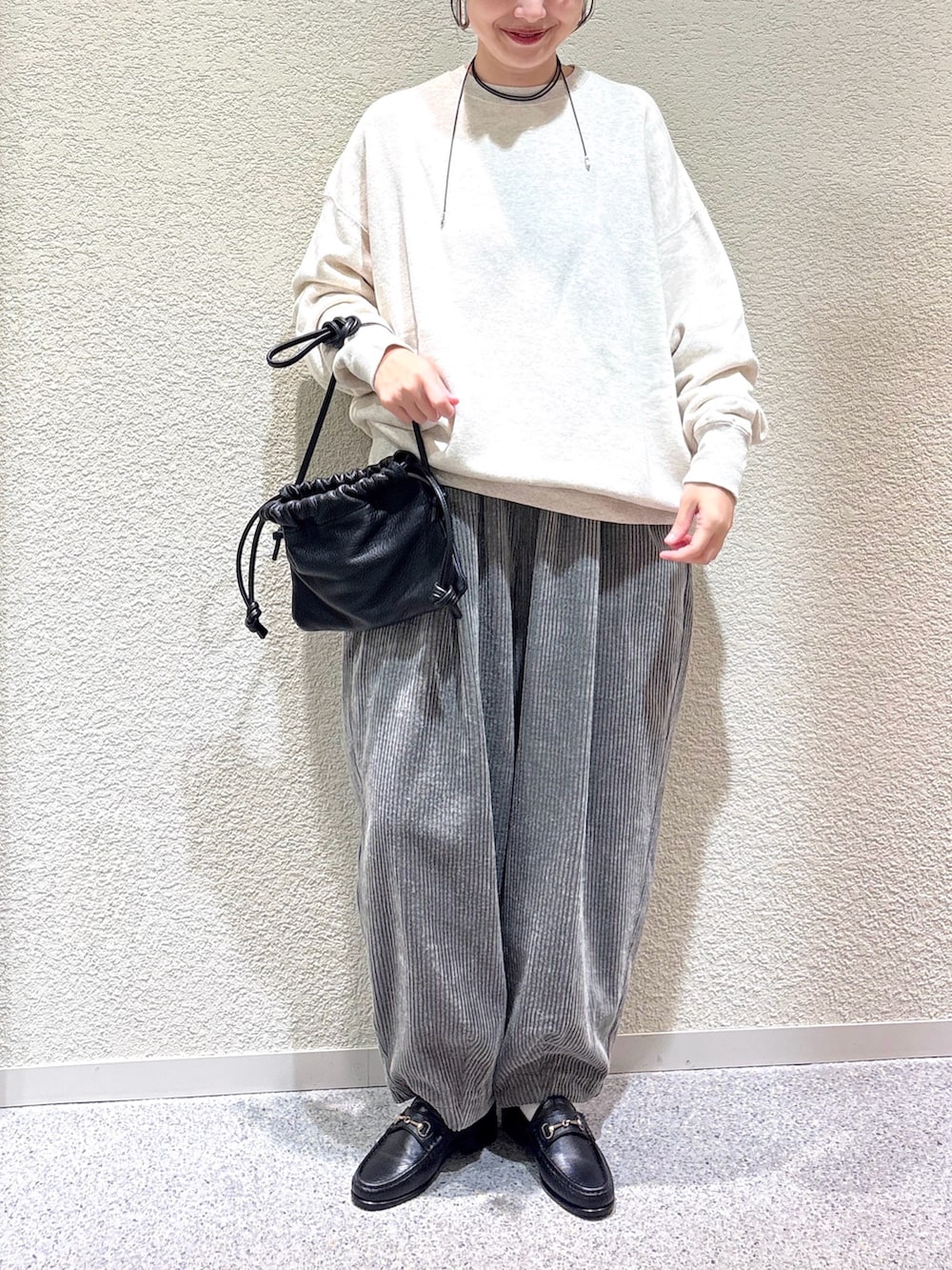 ・柔らかなスウェットとコーデュロイ素材の異素材ミックスで季節感を演出