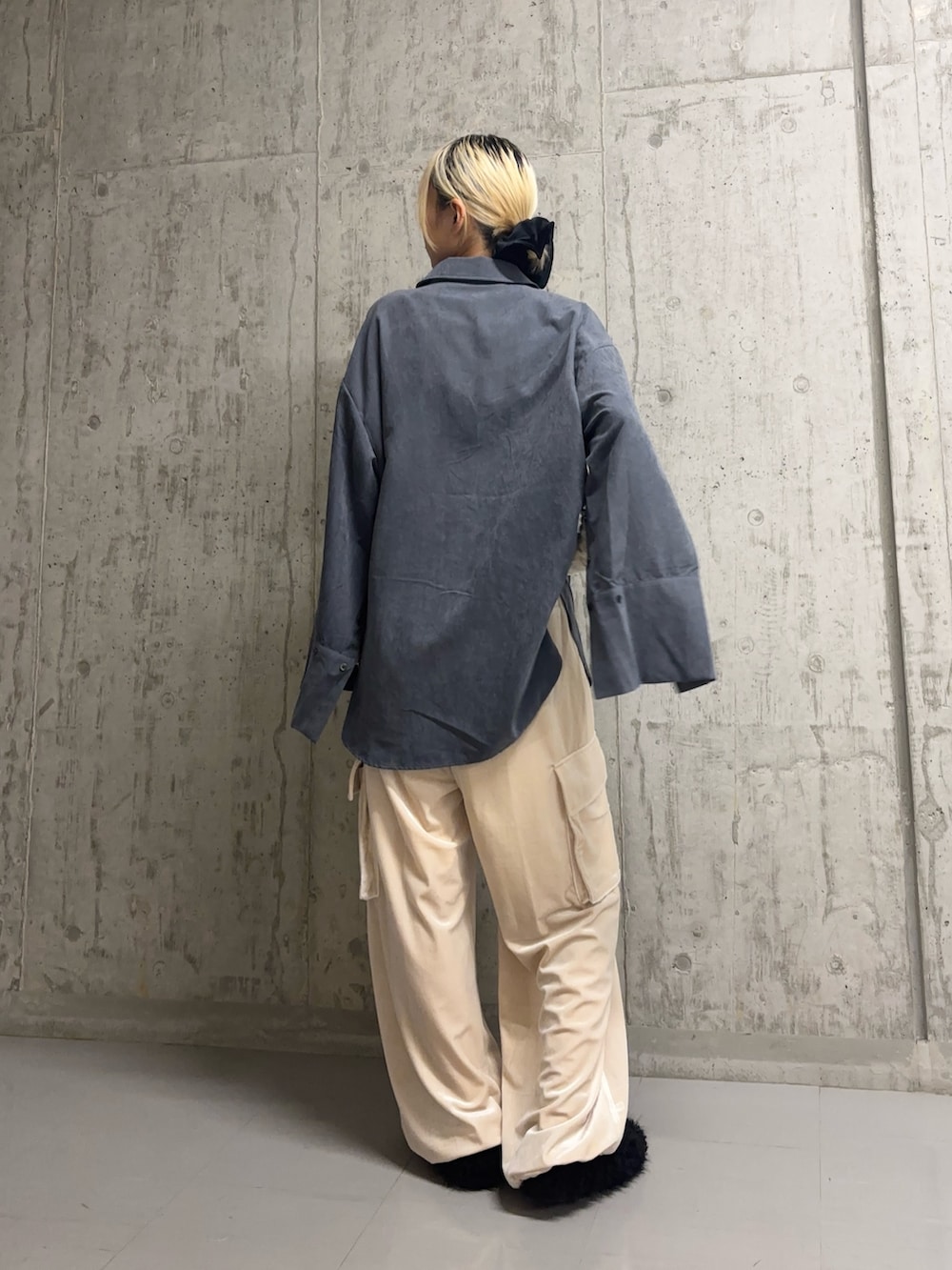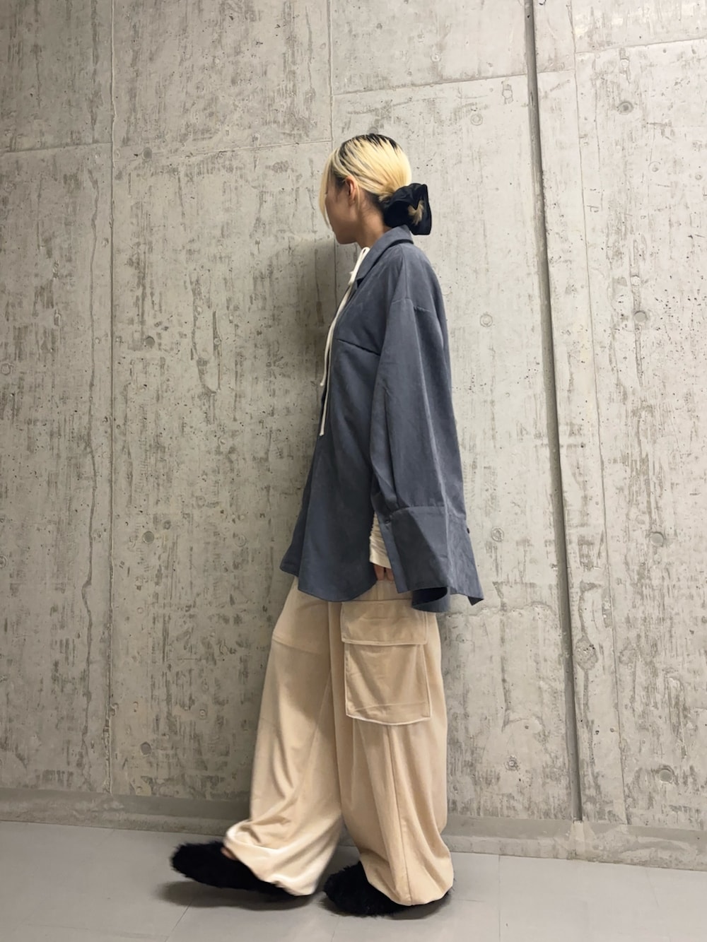 グレーのピーチスキンBIGシャツに、アイボリーのベロアカーゴパンツを合わせたルーズシルエットスタイルにしました❕