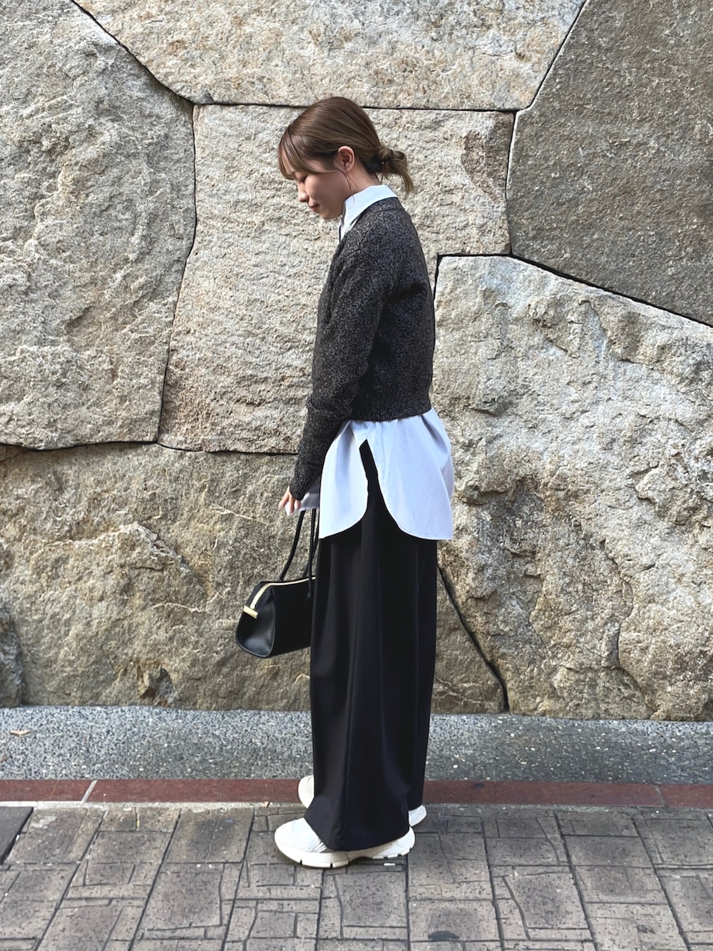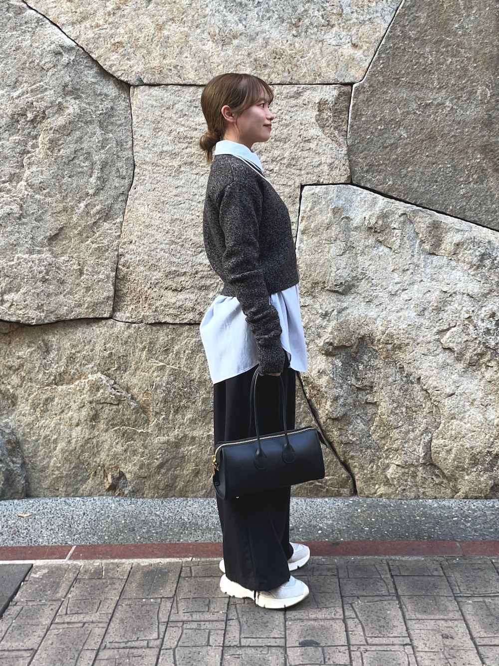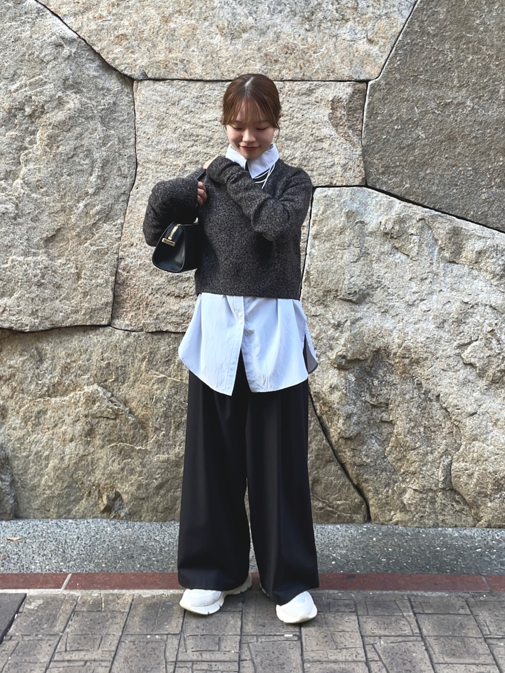 トップスのシャツはアーバンリサーチのダブルボタンコットンヴィスコースシャツです!ブルーの色味とグレーのニットの相性がよく、とても可愛いです!シャツも着やすく、程よいオーバーサイズがバランスよく着ていただけます!