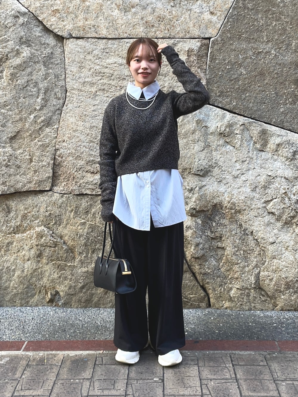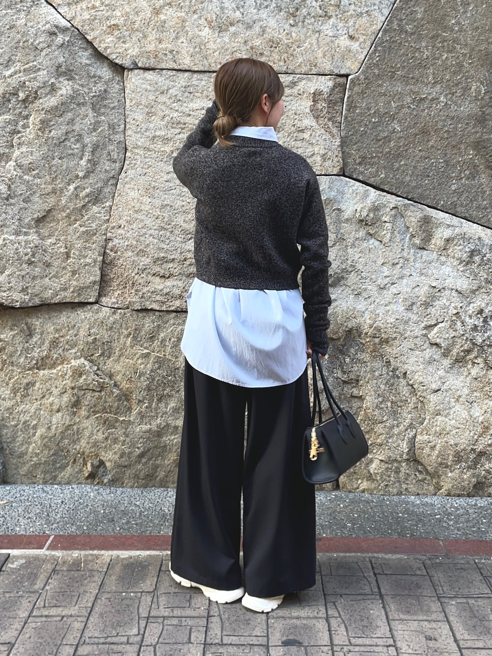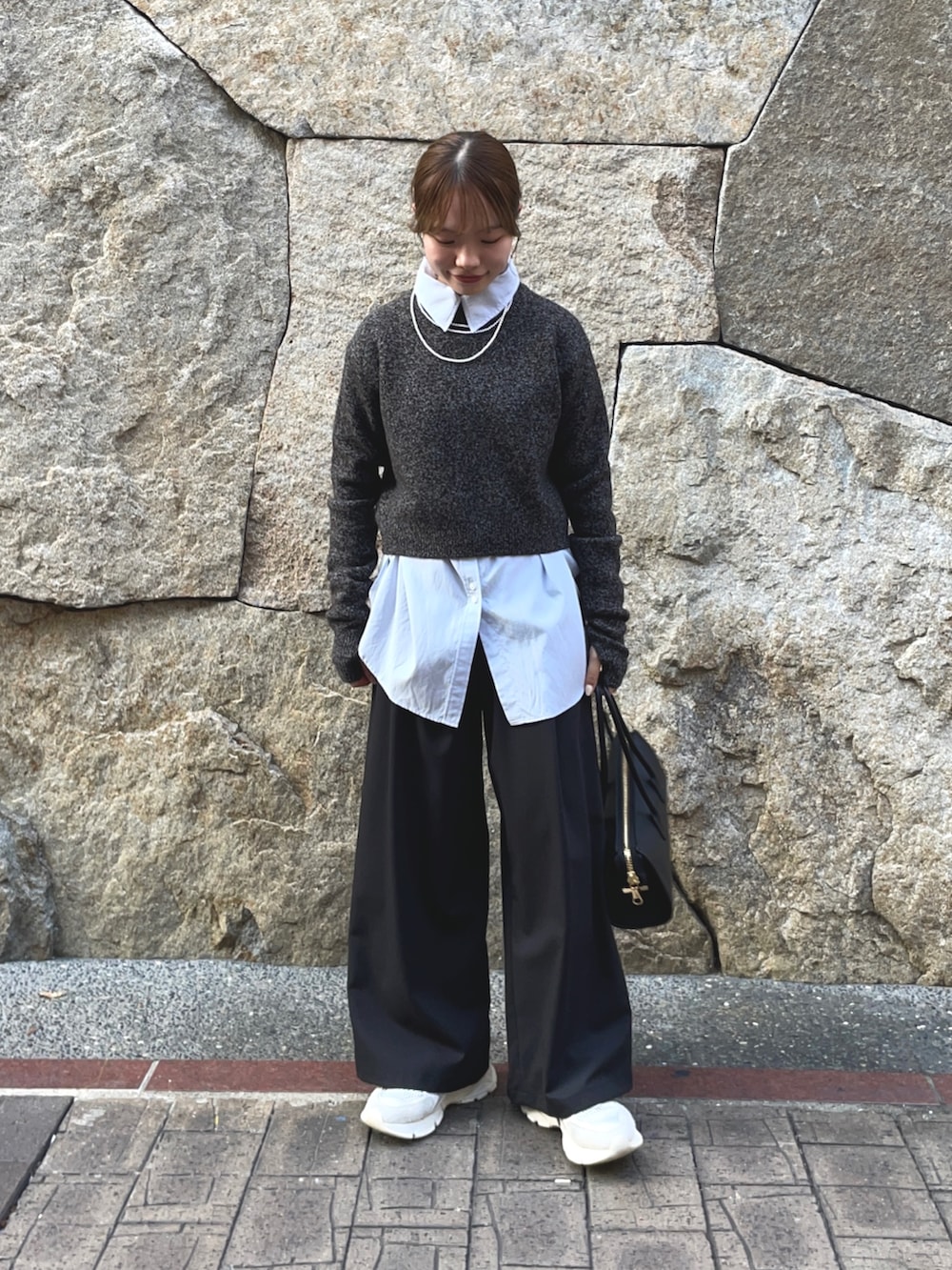 トップスのシャツはアーバンリサーチのダブルボタンコットンヴィスコースシャツです!ブルーの色味とグレーのニットの相性がよく、とても可愛いです!シャツも着やすく、程よいオーバーサイズがバランスよく着ていただけます!