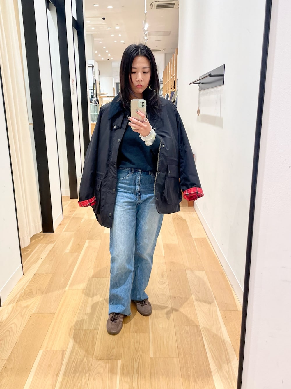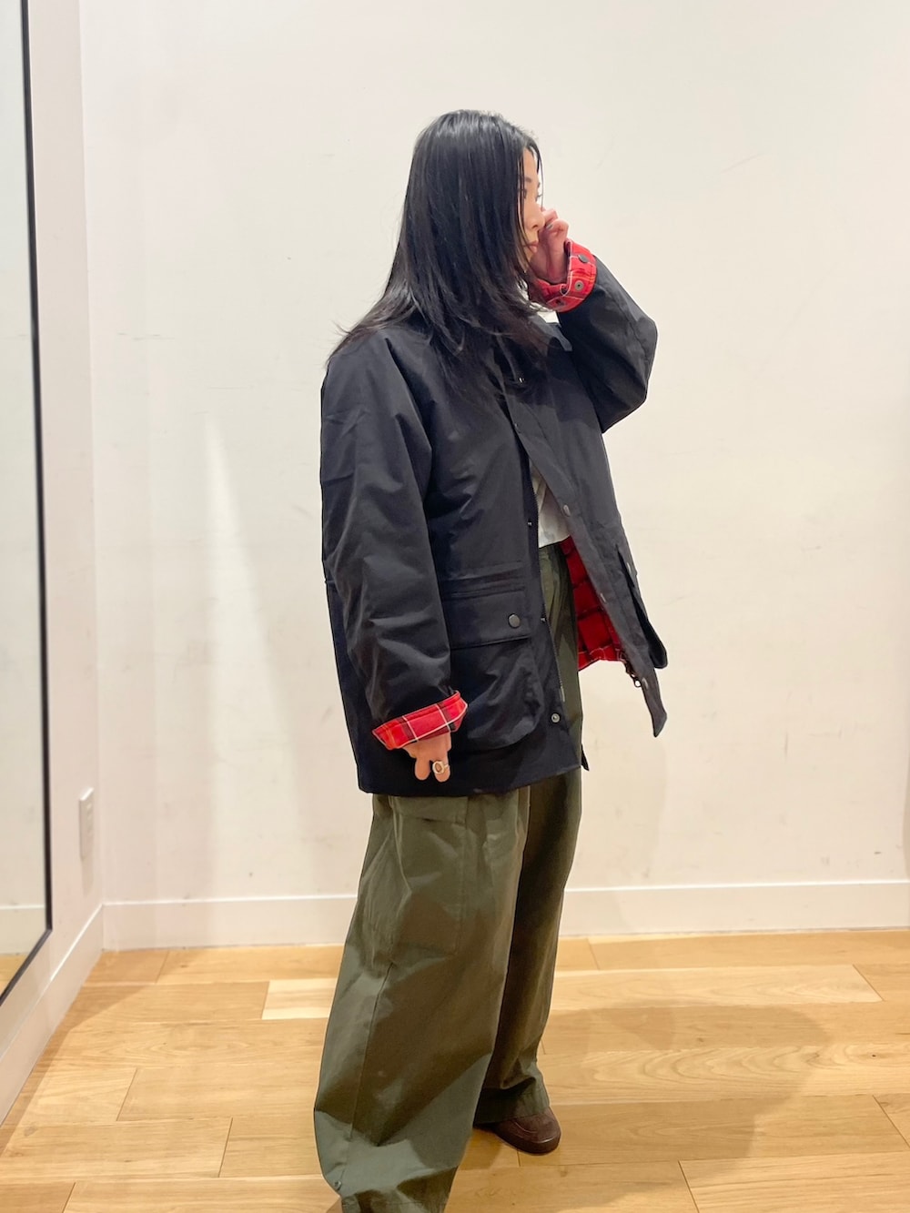 英国生まれのバブアーが中綿となって登場しました!王道のセージも良いけど、黒赤の大好きなカラーを選びました!型はみんな大好きビデイルです。カーキのパンツと茶色のadidasガゼルを合わせ古着っぽいテイストで。2枚目でデニム合わせも着てみました!