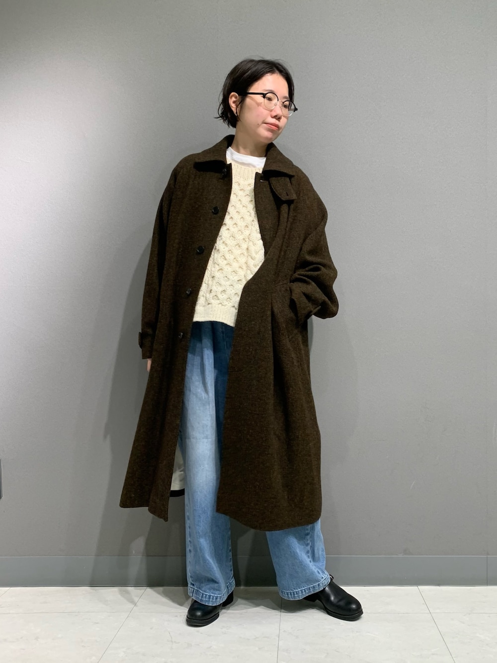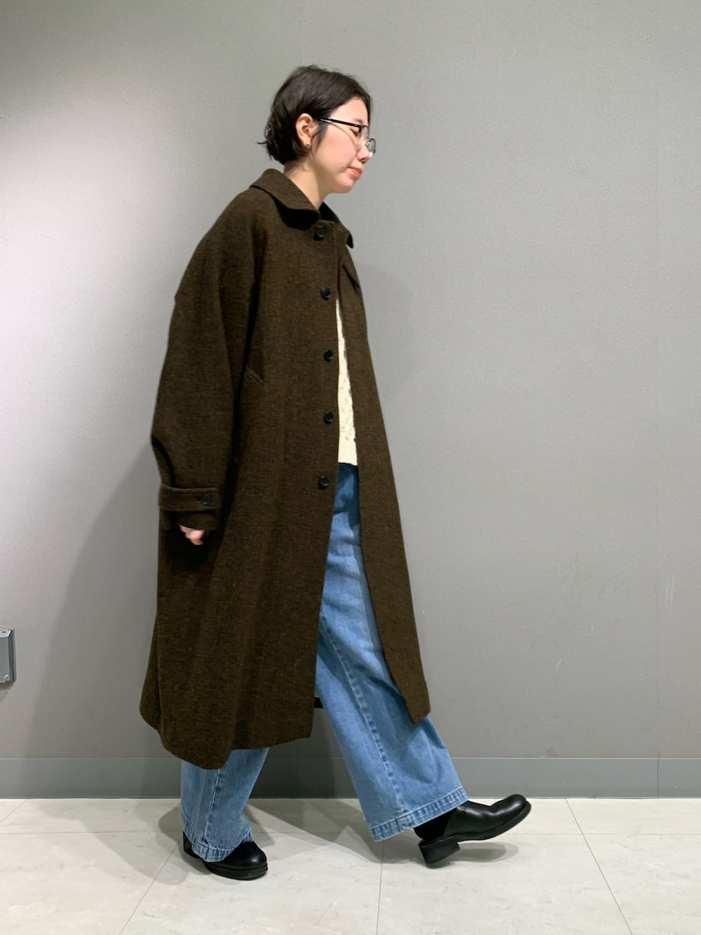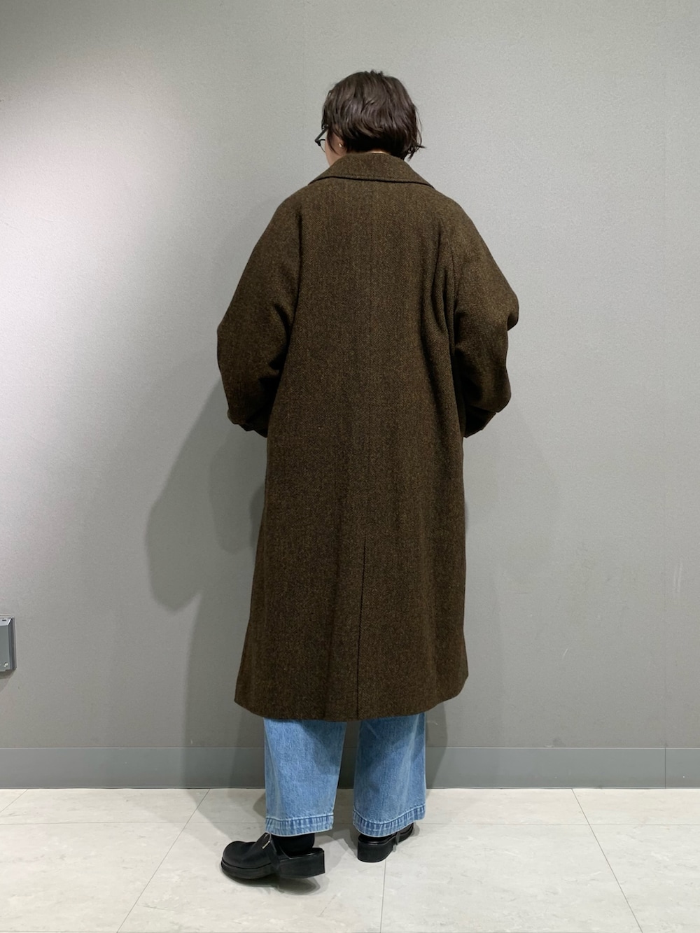 ヘリンボーンのブラウンコートです。奥行きのある色合いで趣のあるヘリンボーン織になっております。ふっくらとした生地感でウール100%でも軽い着心地になっています。ゆとりのあるサイズ感で厚手なニットも中に着ていただけます。私はサイズ1で少し余裕があります。
