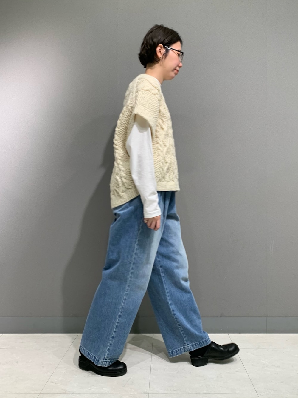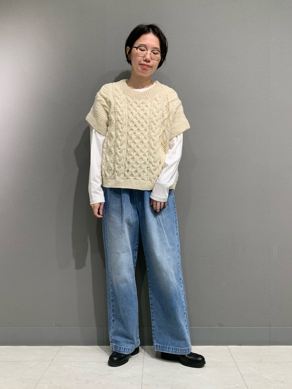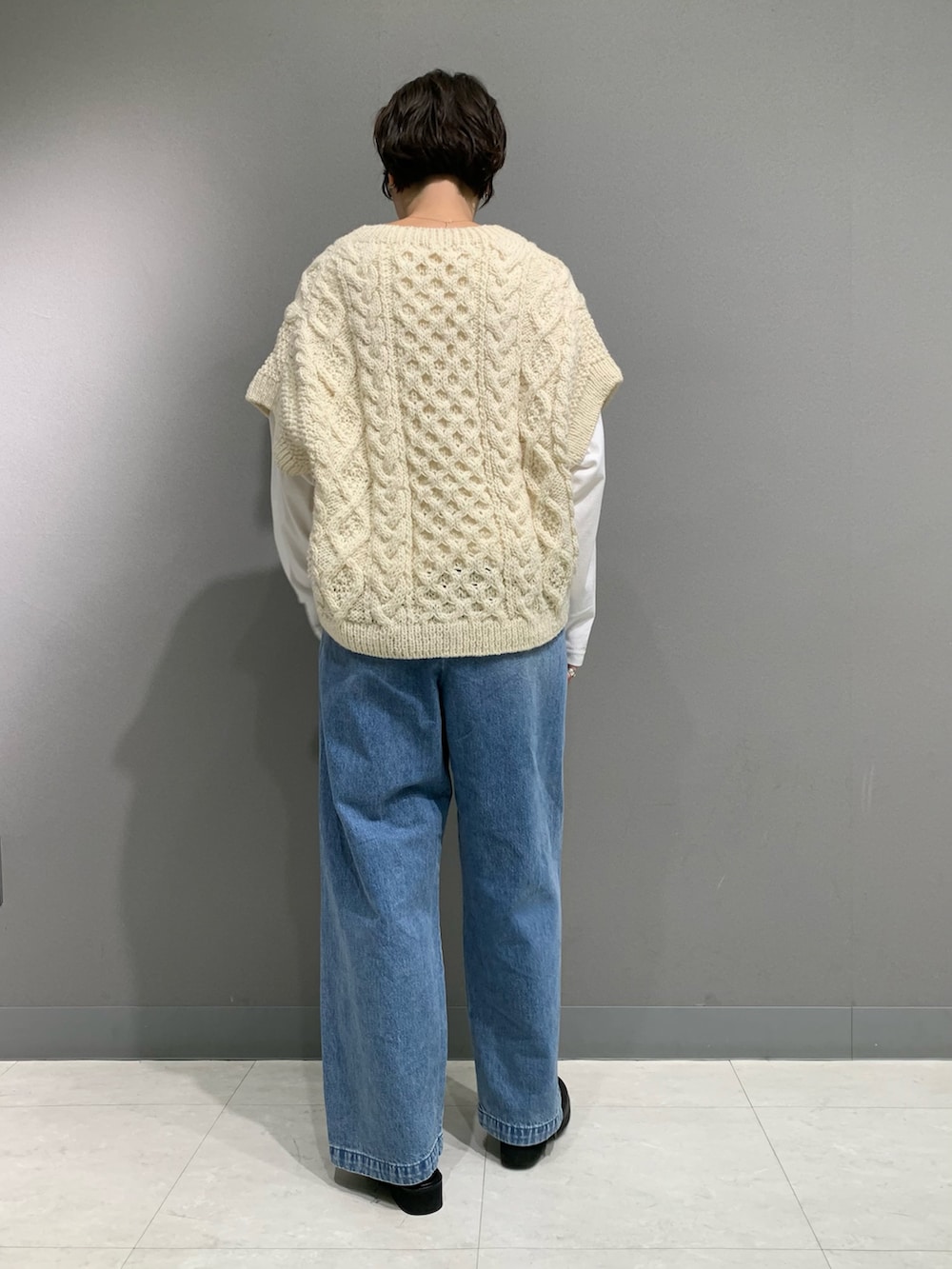 アラン編みのゆったりとしたニットベストです。Tシャツやブラウスと合わせやすい首開きになっています。