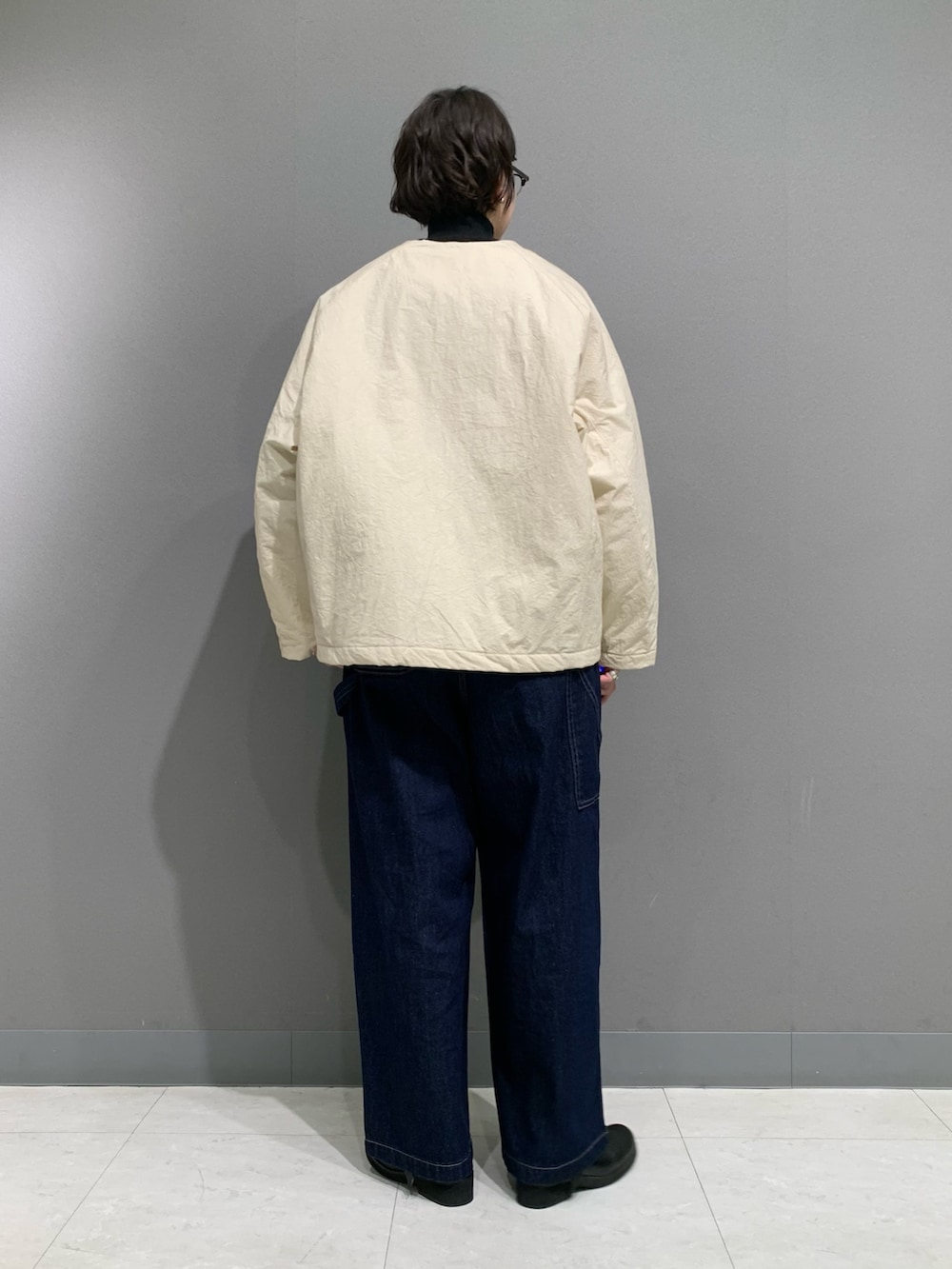 中綿入りのショートコートです。コットン100%のサラッとした素材で毛玉が出来ず軽い着心地で使い勝手が良いです。首元がスッキリしているのでストールやタートルネックなどのアイテムが映えます。中を着込んでいただければ真冬もお使いいただけます。