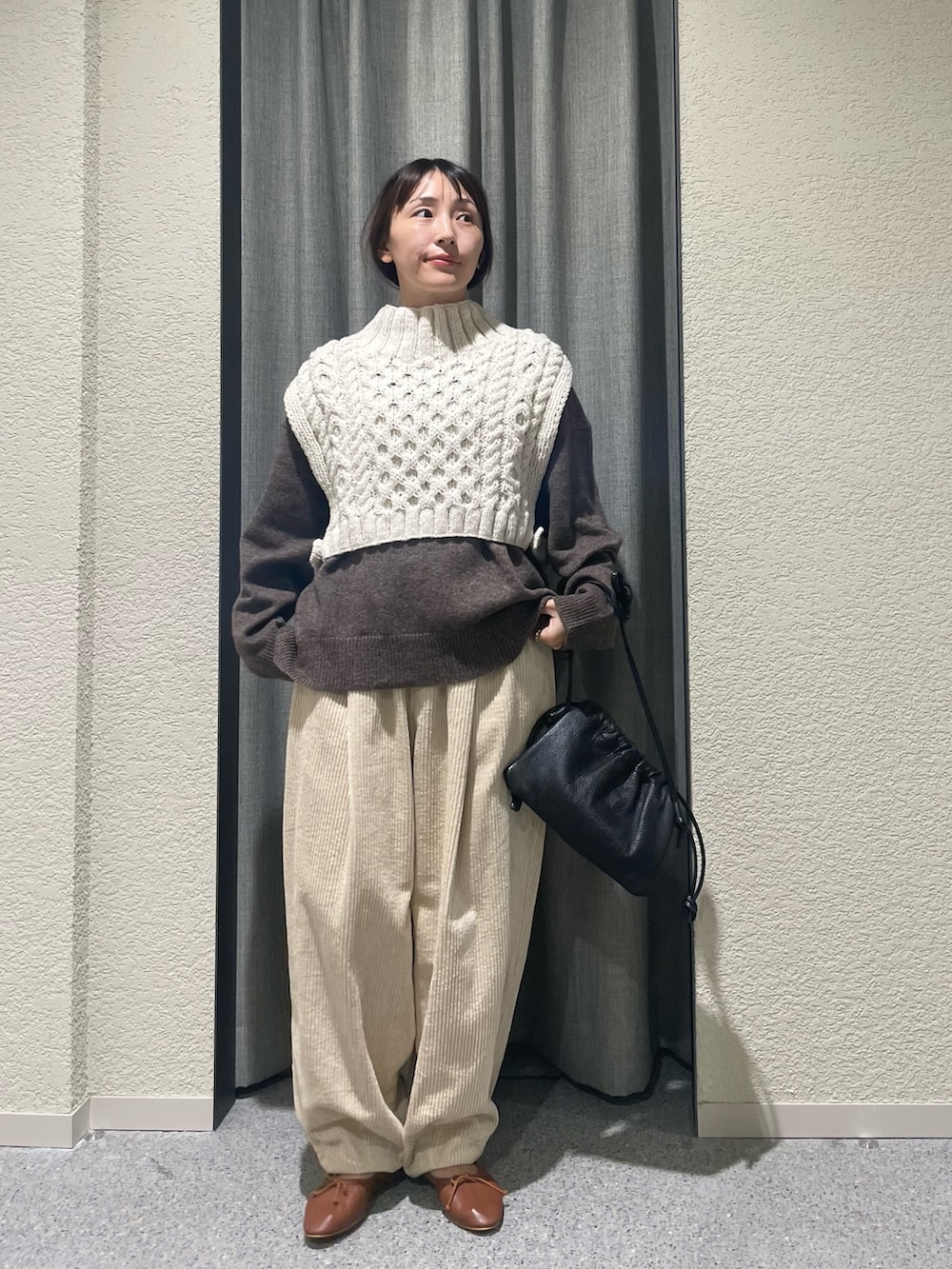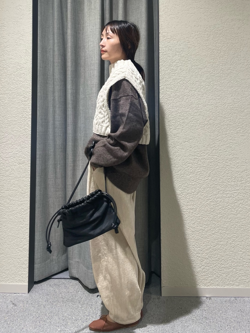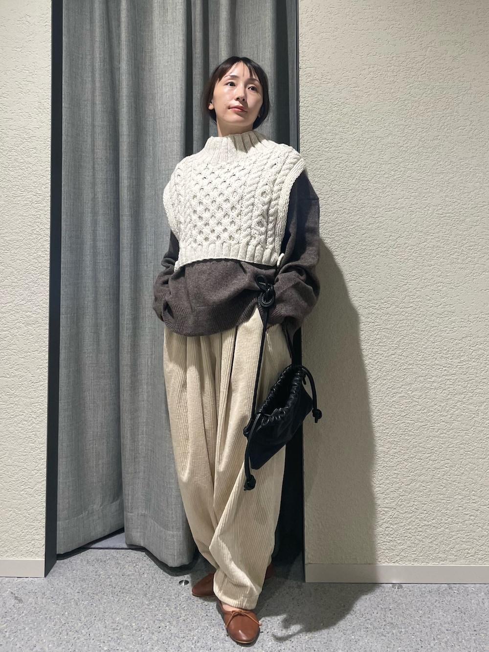 こちらも推しのゆったりとしたヤクウールVネックニットの上からでもらくらく着用できました!