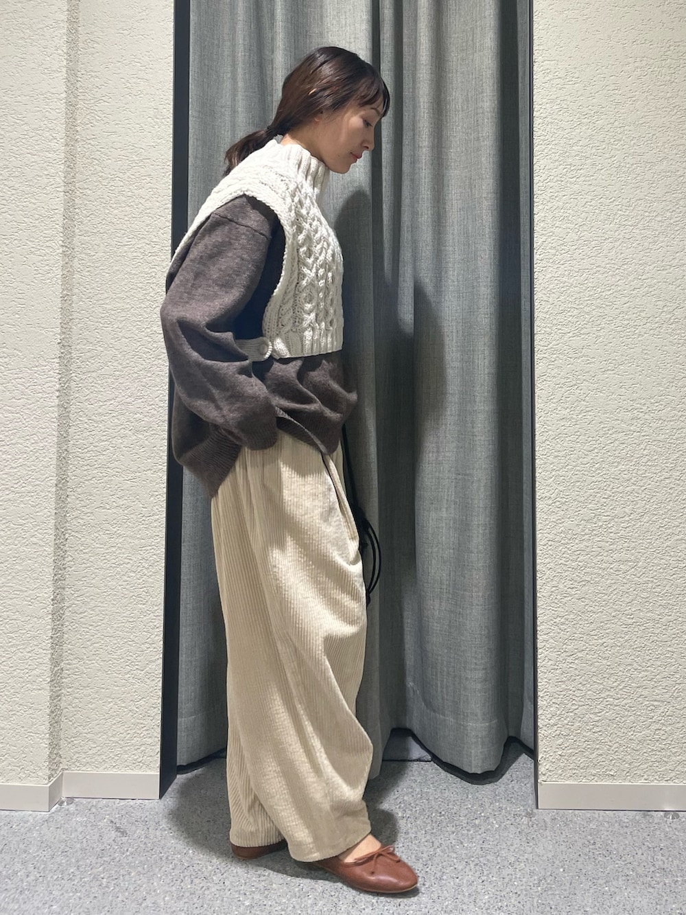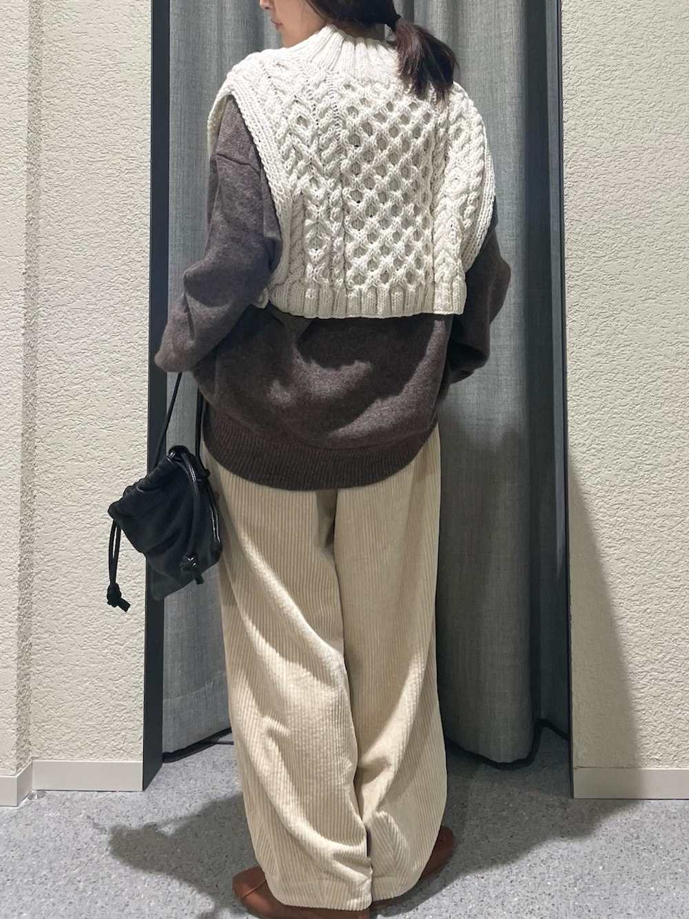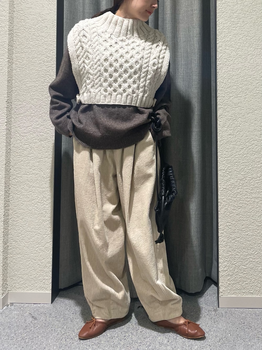 こちらも推しのゆったりとしたヤクウールVネックニットの上からでもらくらく着用できました!
