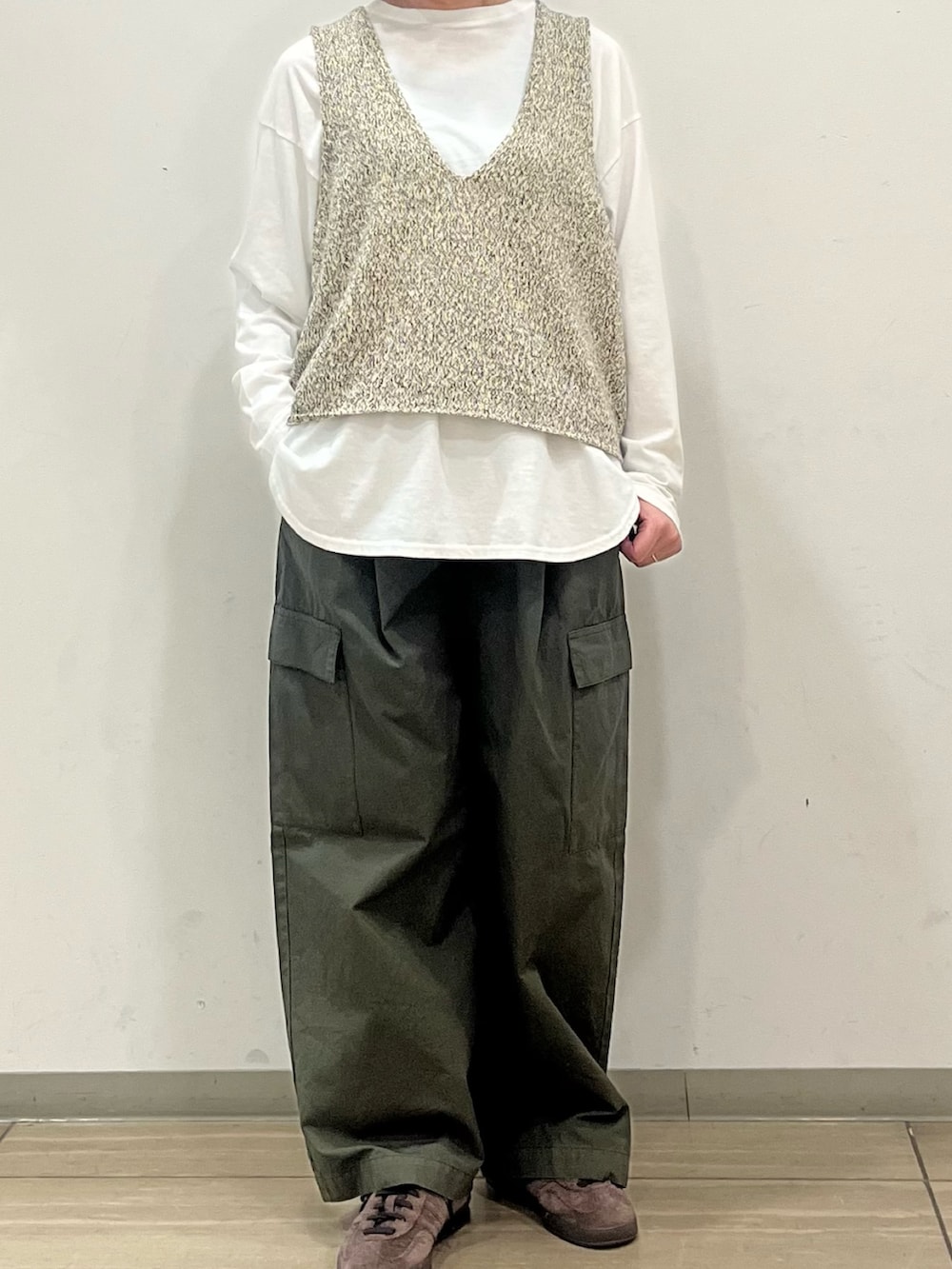 メランジカラーが可愛いテープヤーンニットベストは綿100%なので、長い時期着て頂けます。