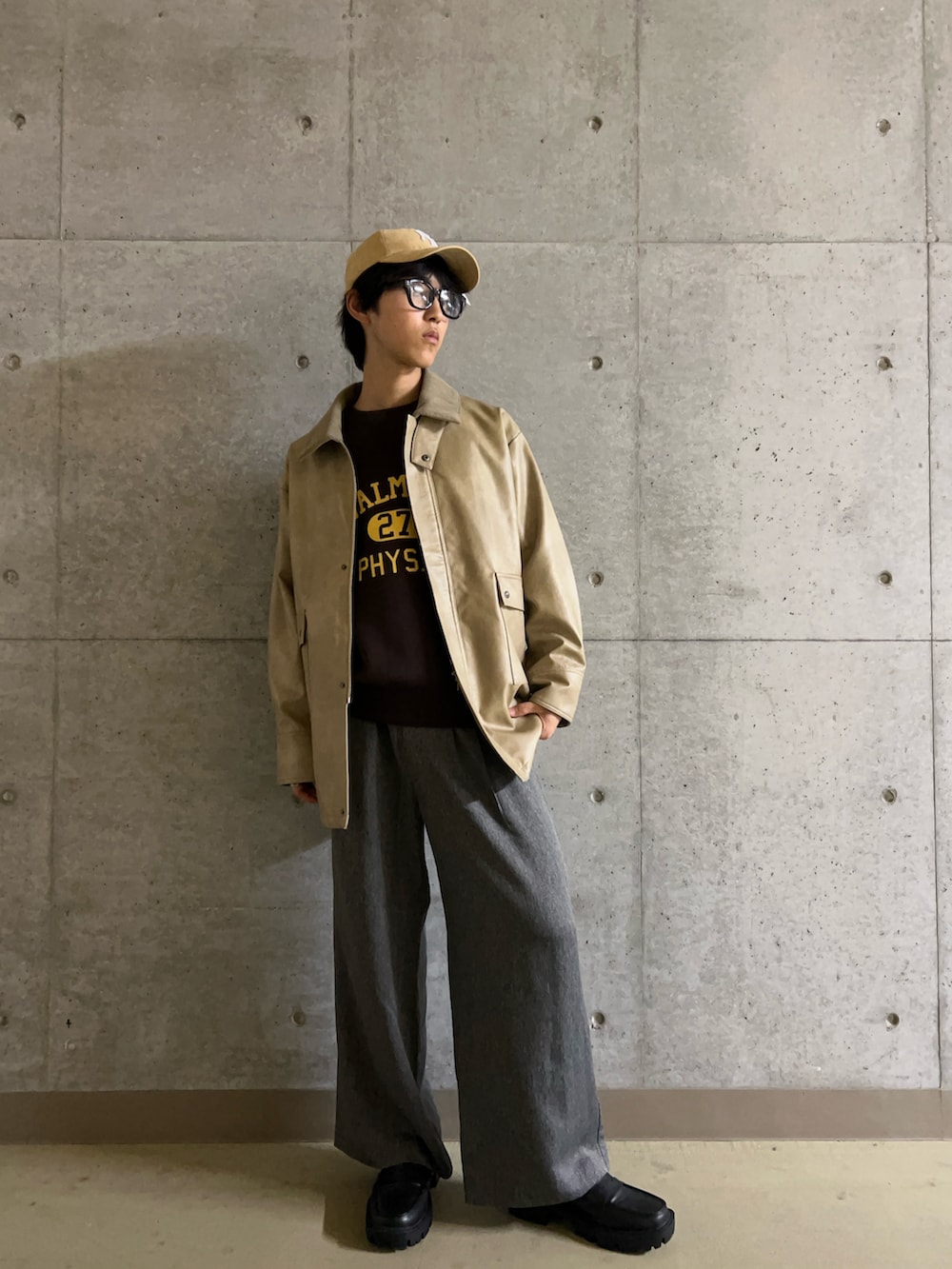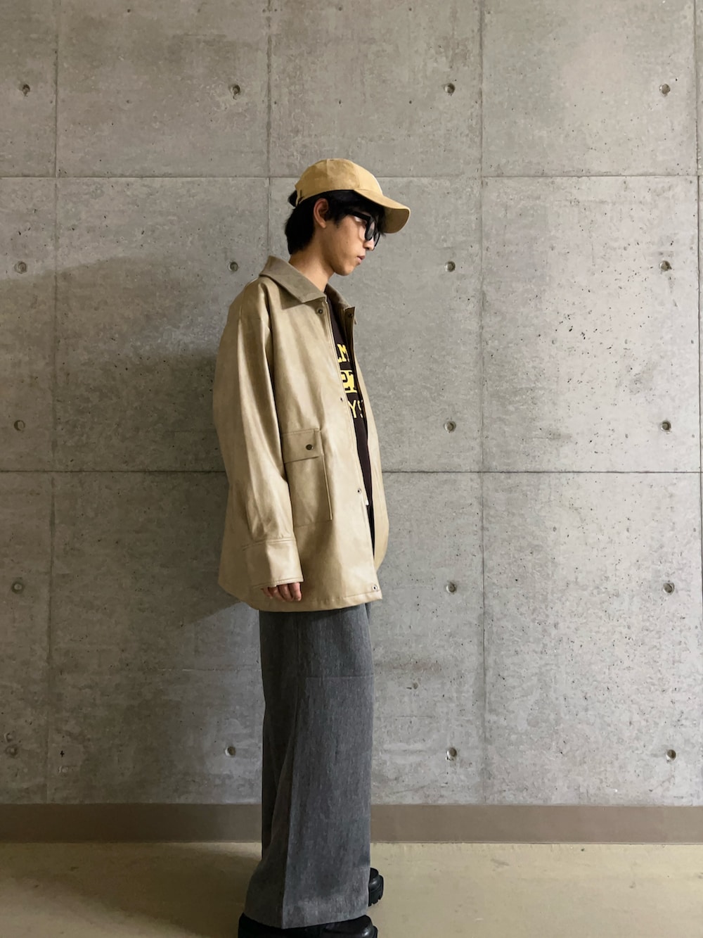 今回ははカジュアルながらも洗練された雰囲気のコーディネートになっています!ベージュのフェイクレザージャケットとグレーのワイドパンツの組み合わせがシンプルでありながら、落ち着いたおしゃれさを演出しています!ニューヨーク・ヤンキースのキャップとロゴ入りのTシャツで、スポーティーなアクセントが加わり、リラックス感のあるスタイルに仕上がっています!全体的にシンプルでありながら、アクティブな印象のスタイリングが魅力的です!お出かけにぴったりなコーデなのでぜひ試してみてください!