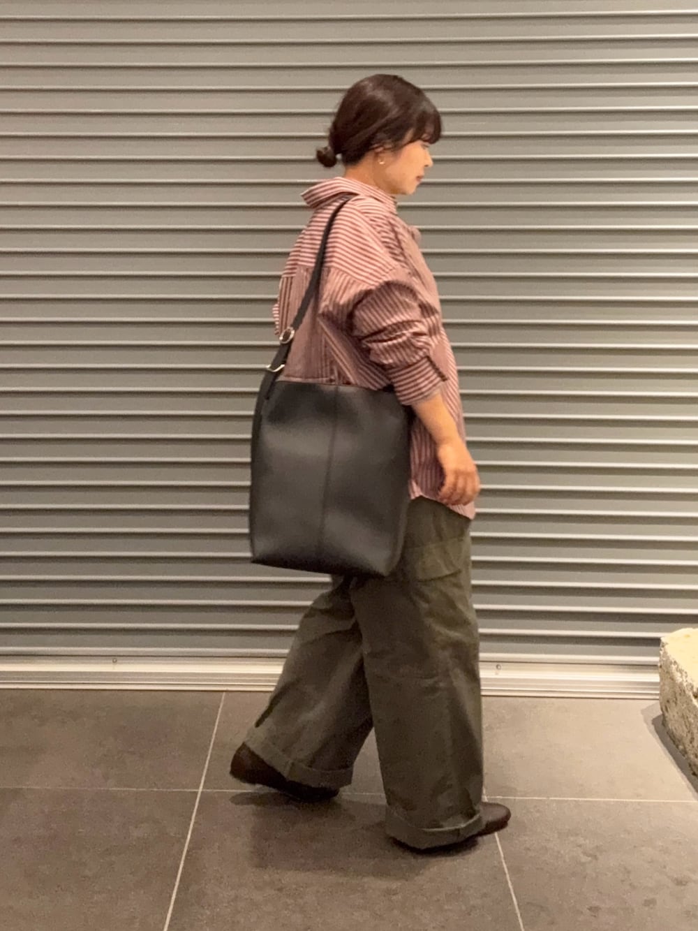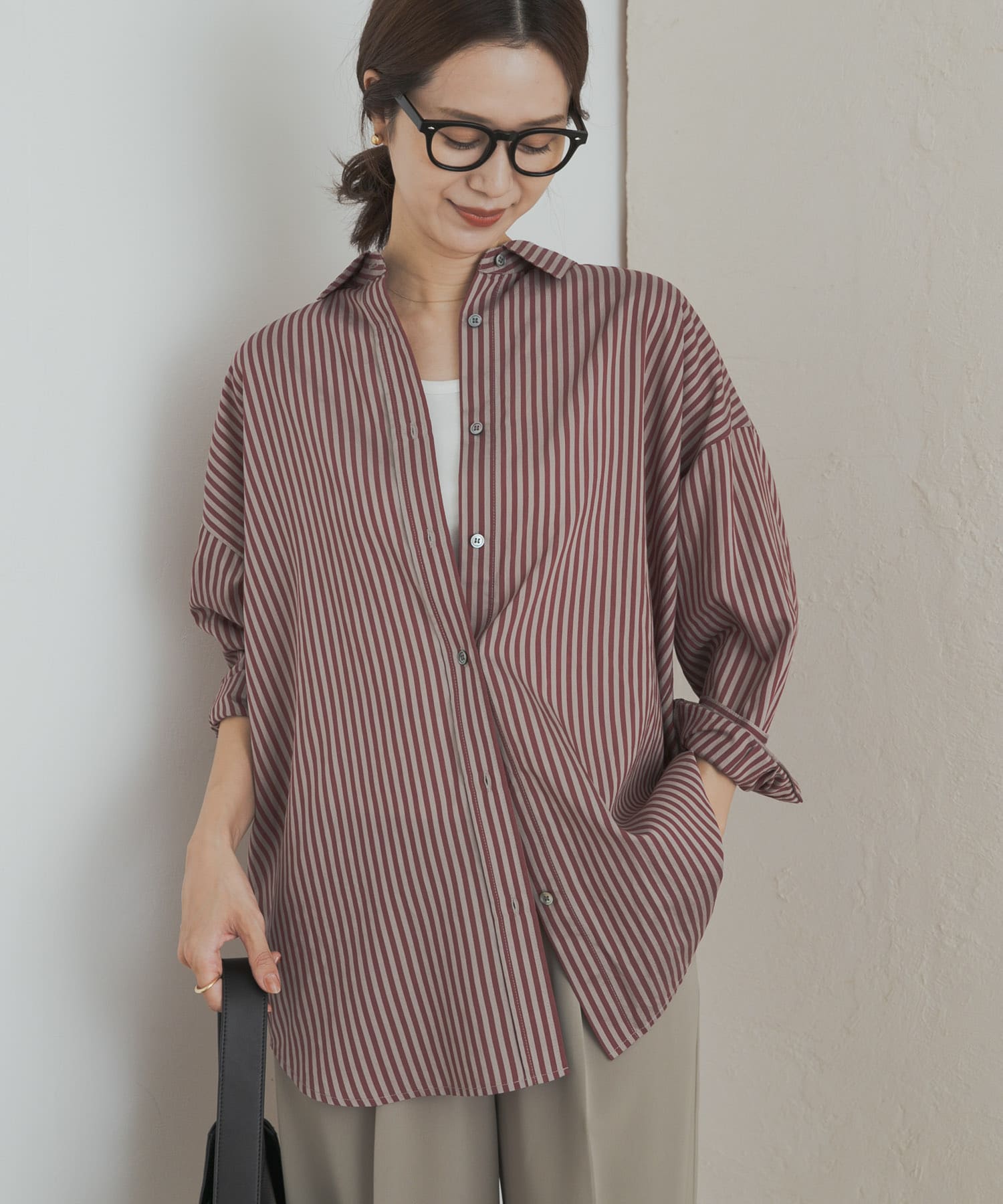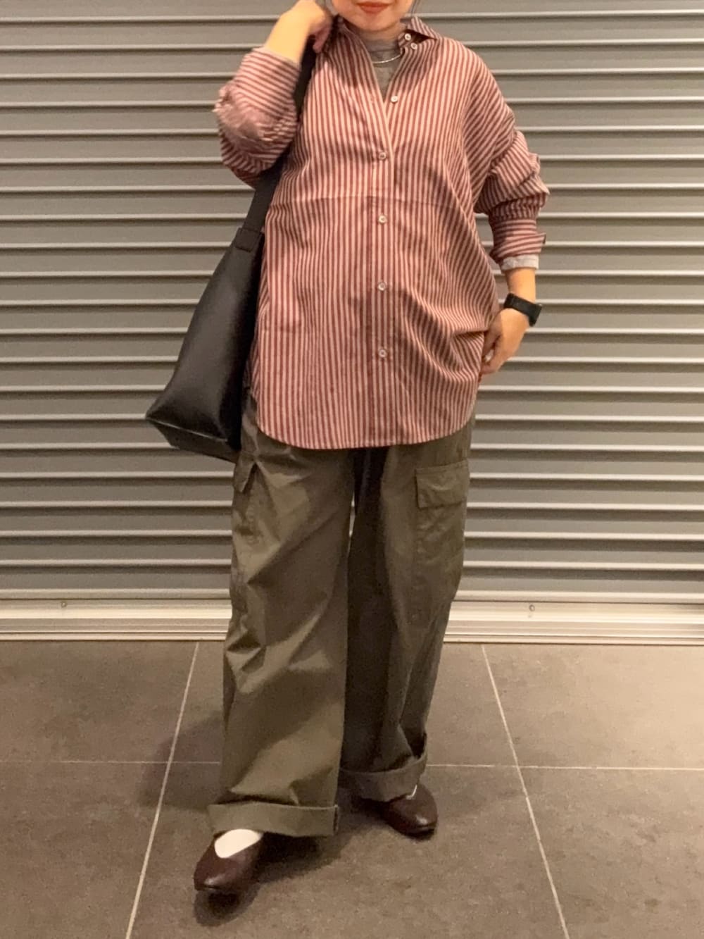 薄手でゆったり着れるので、季節の変わり目に重宝するシャツです。今回は肌寒い日にもおすすめのベロアロンTをインナーに着ました。