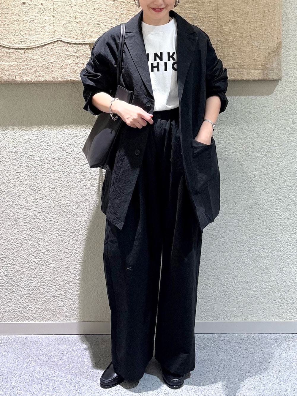 ・ジャケット×ロゴTで、抜け感のある大人のモードカジュアルを演出。