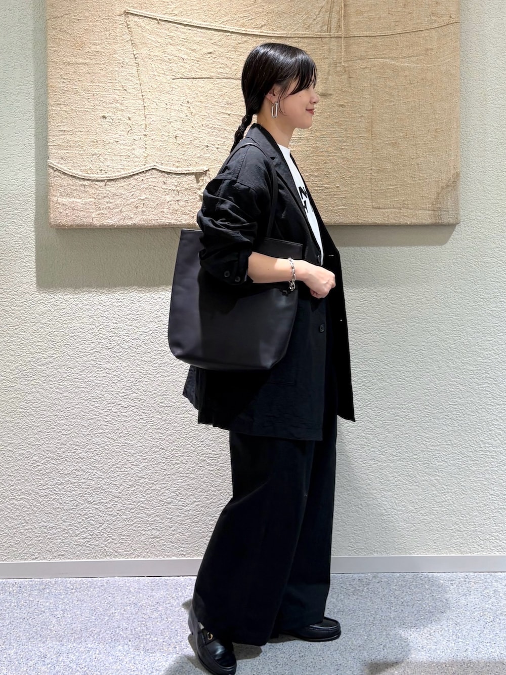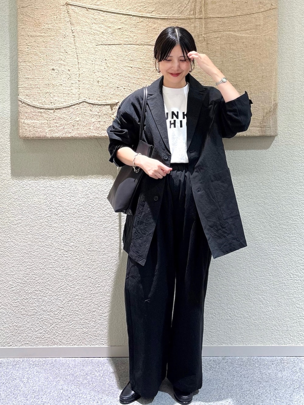 ・上下ブラックにホワイトのTシャツを差し込み、コントラストの効いたスタイルに。