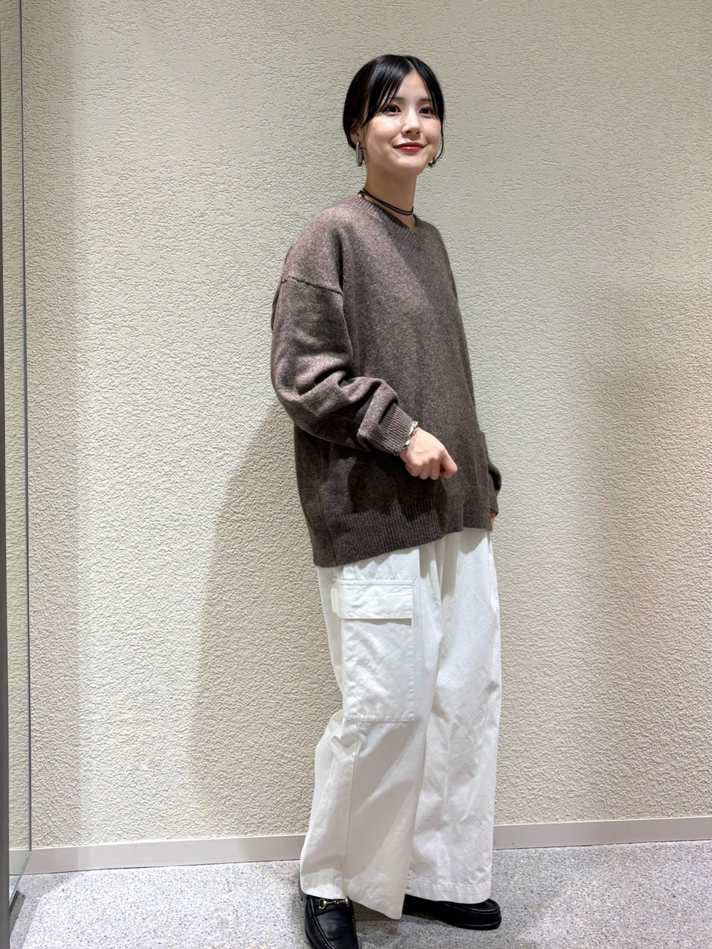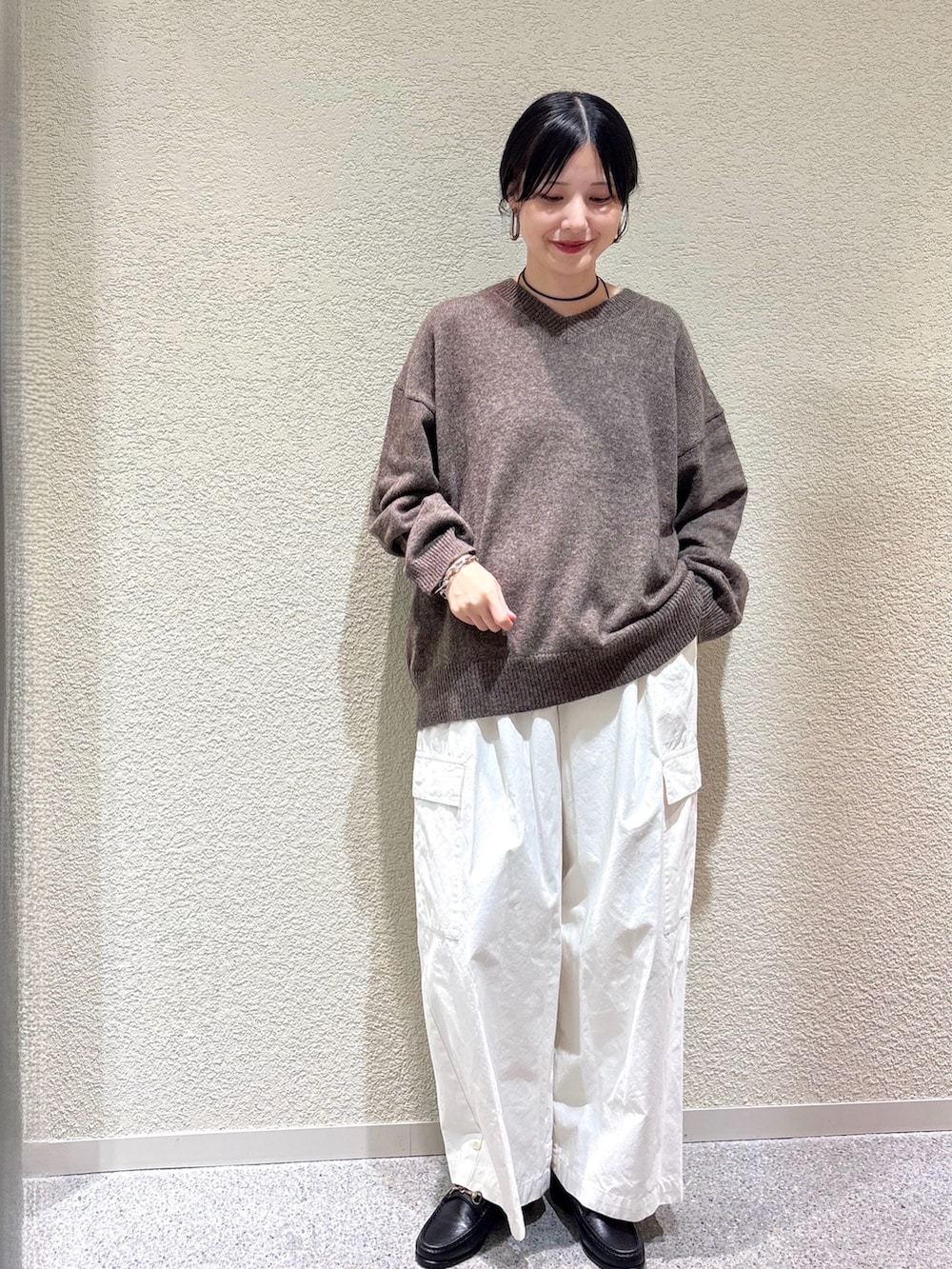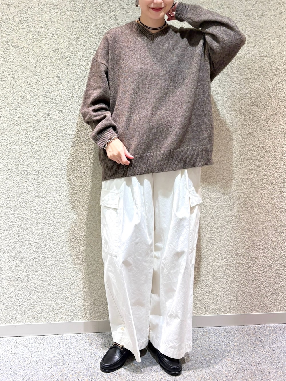 ・深めVネックからインナーを少し覗かせて抜け感をプラス。