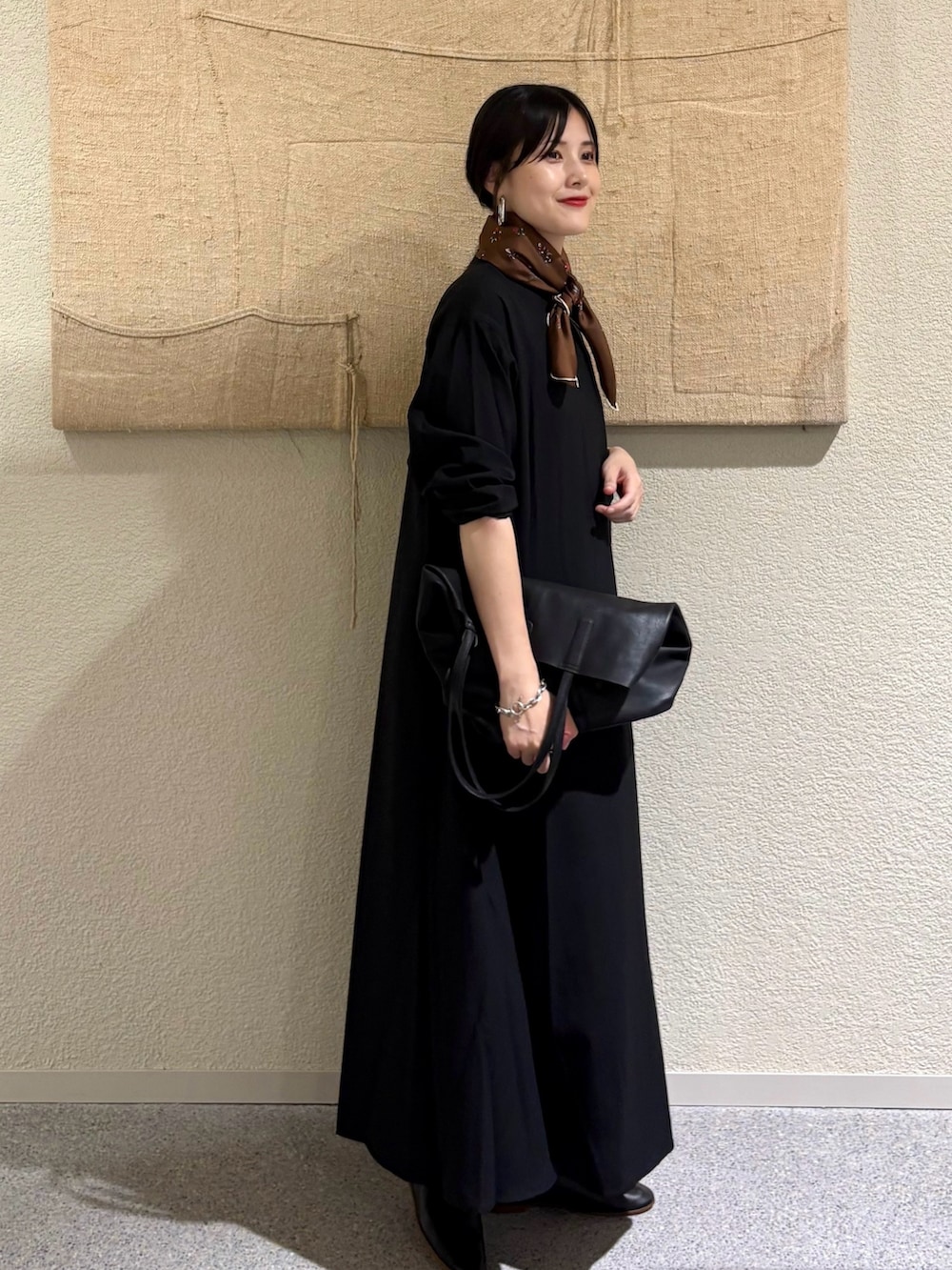 ・首元にブラウンのスカーフを巻いて、程よく華やかさと温かみをプラス。