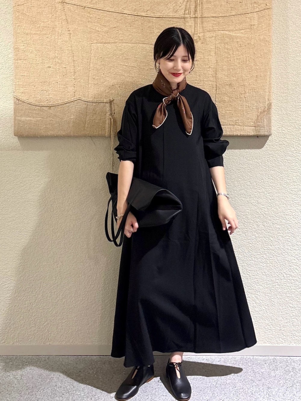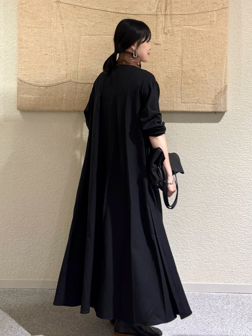 上品なフレアシルエットが美しいウール素材のロングワンピース。ほどよい厚みで一枚でも着映えし、動くたびに揺れるラインが女性らしさを引き立てます。ブラックカラーが全体を引き締め、シックで落ち着いた印象に。