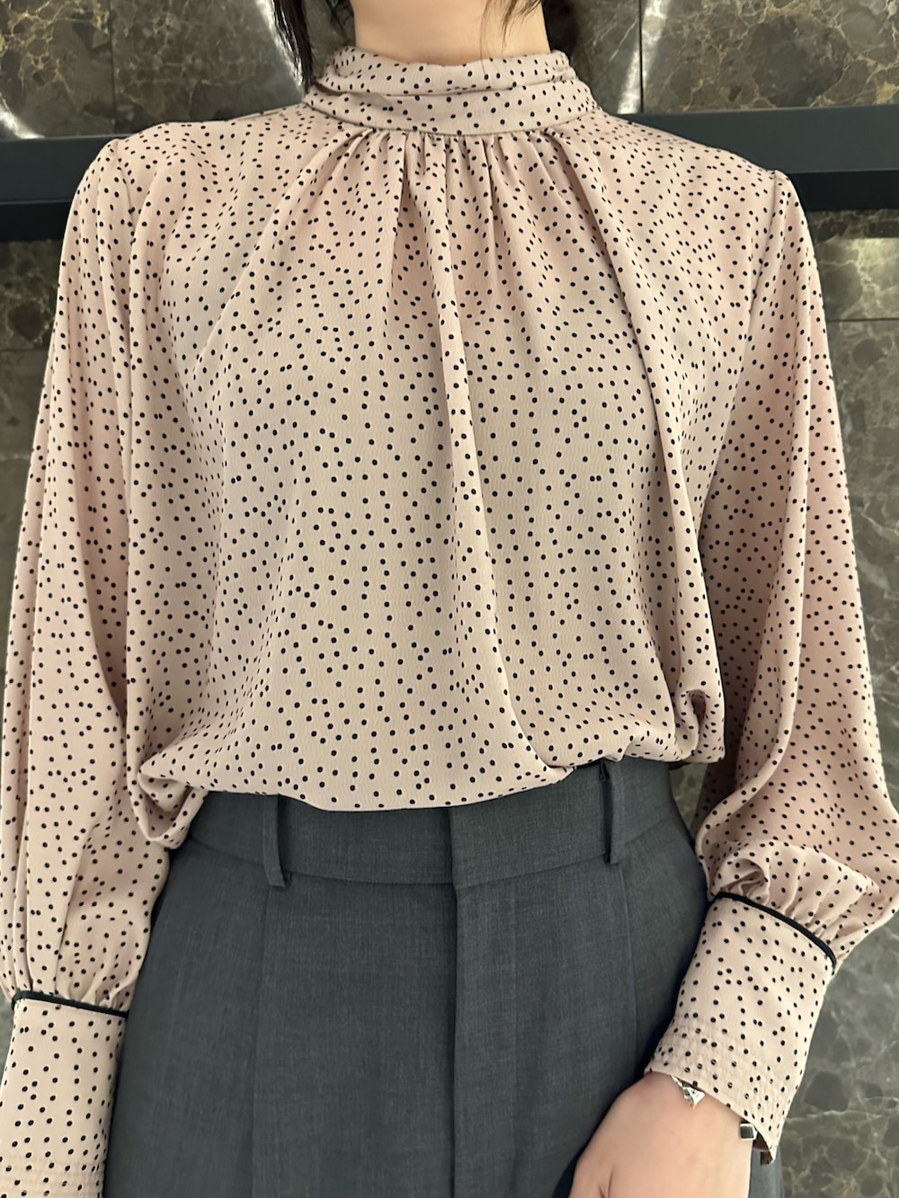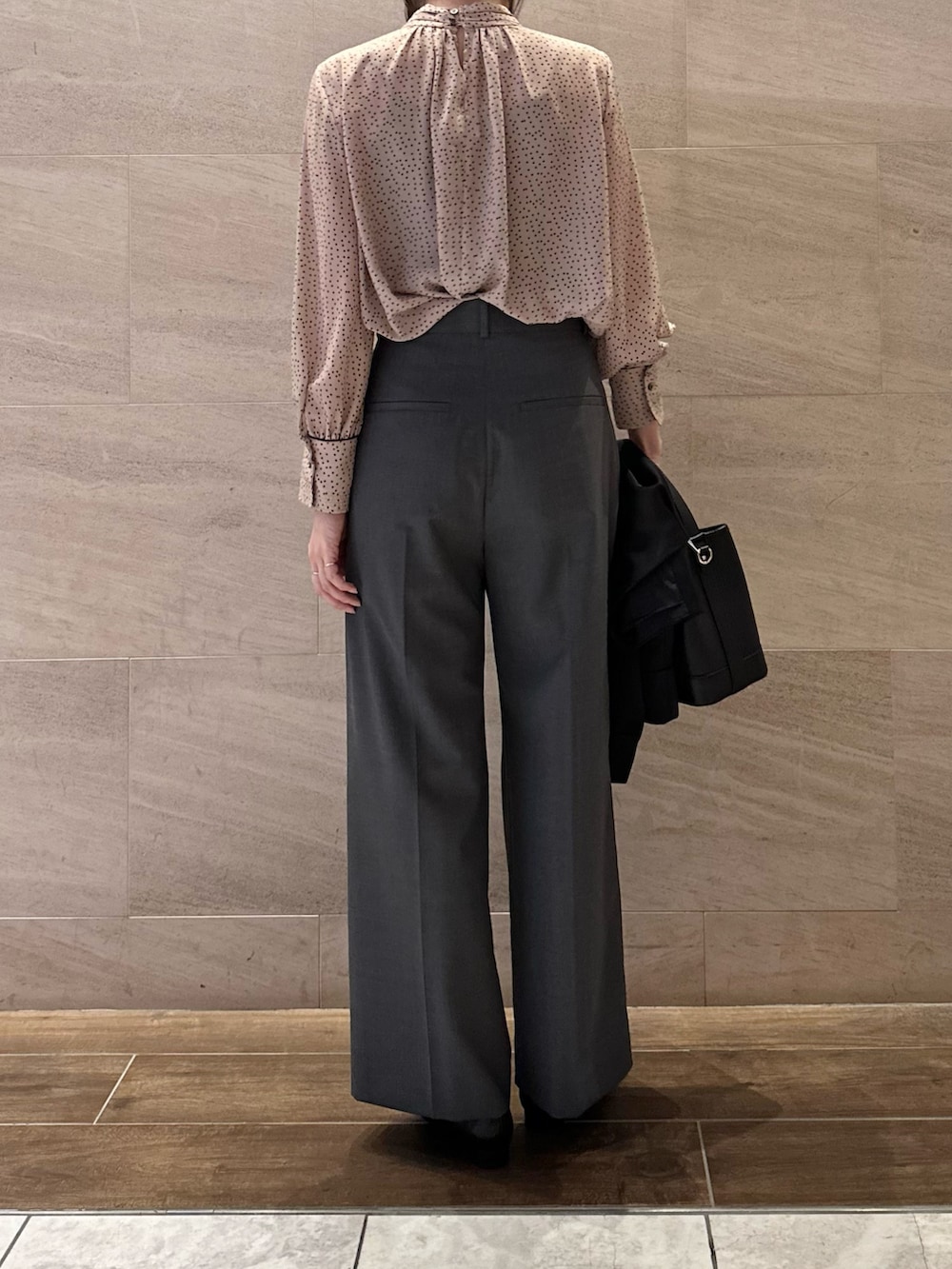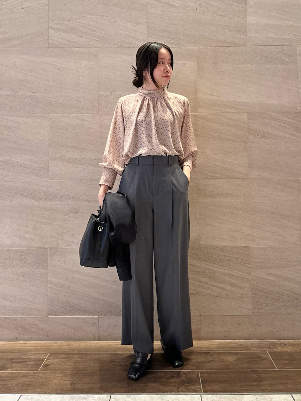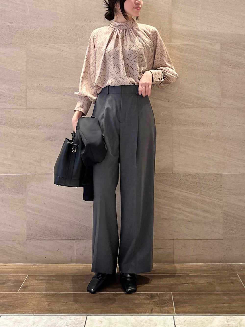 肩幅が広いので普段ハイネックは避けがちですが、着てるブラウスは首元にギャザーがたっぷり施されているのですっきり着れました◎