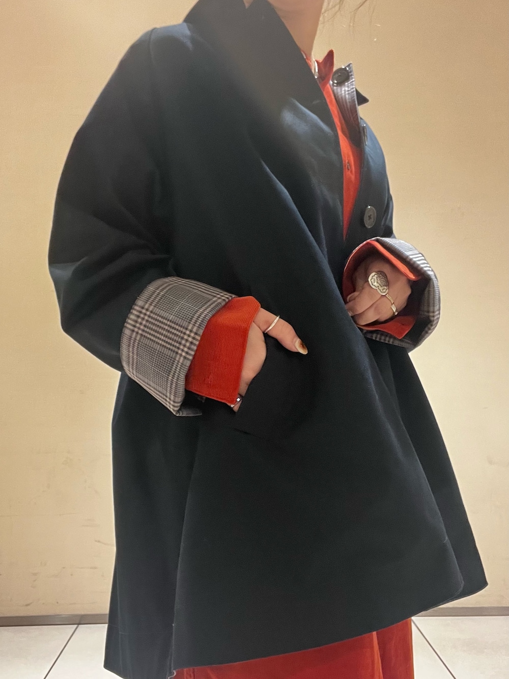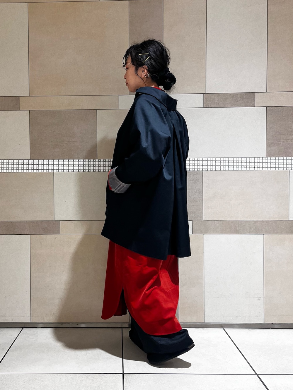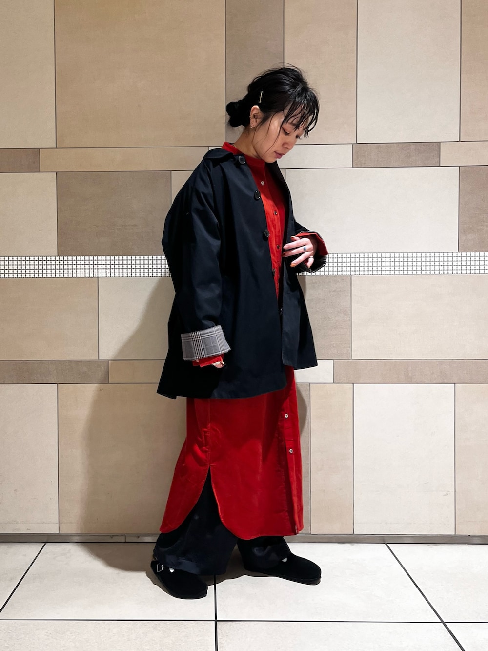 Aラインのほんのり広がりのあるシルエットですが、落ち感もあるので大きく見えづらい優秀デザイン