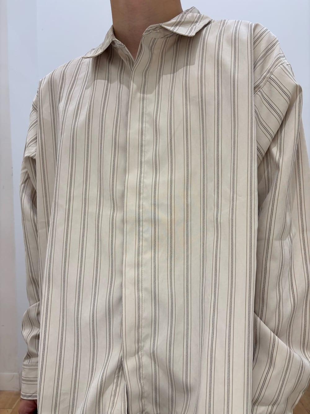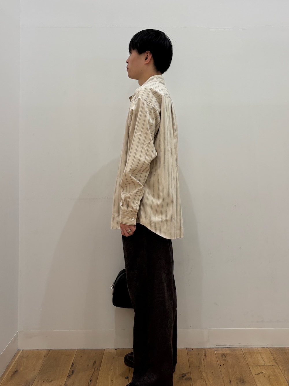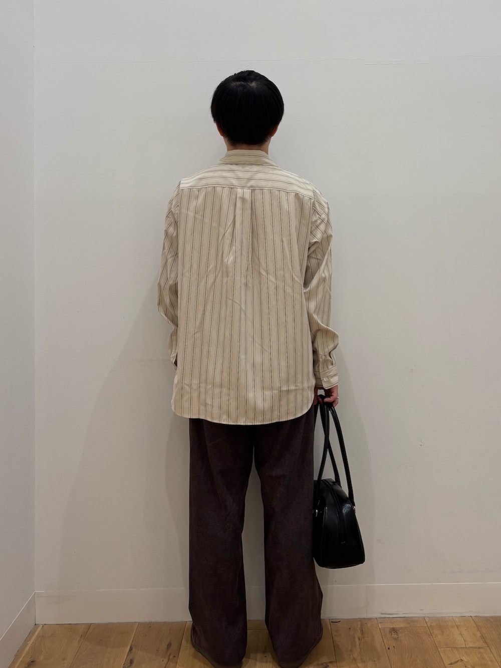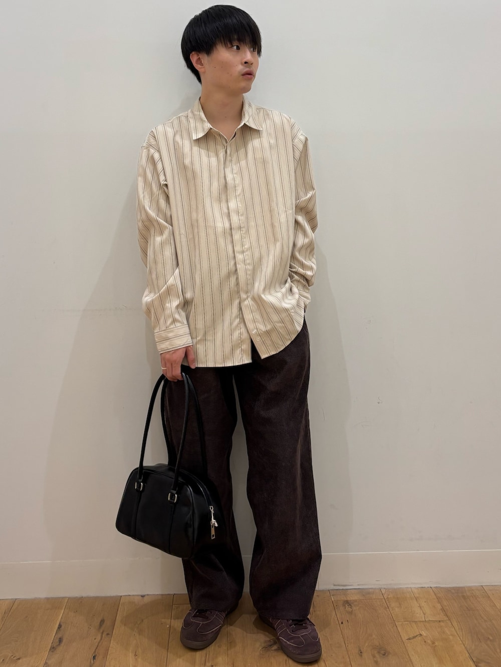 ベージュを主とし、ブラウンの縦線が入っているシャツです!