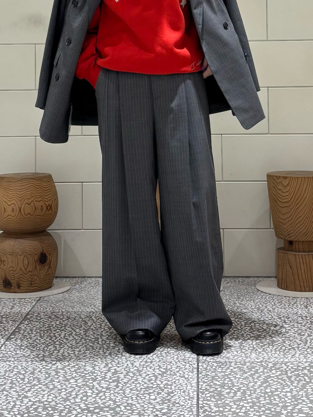 ジャケットとセットアップで履けるワイドパンツです。ゆったりとしたシルエットがきっちりとしすぎない抜け感を与えてくれます。