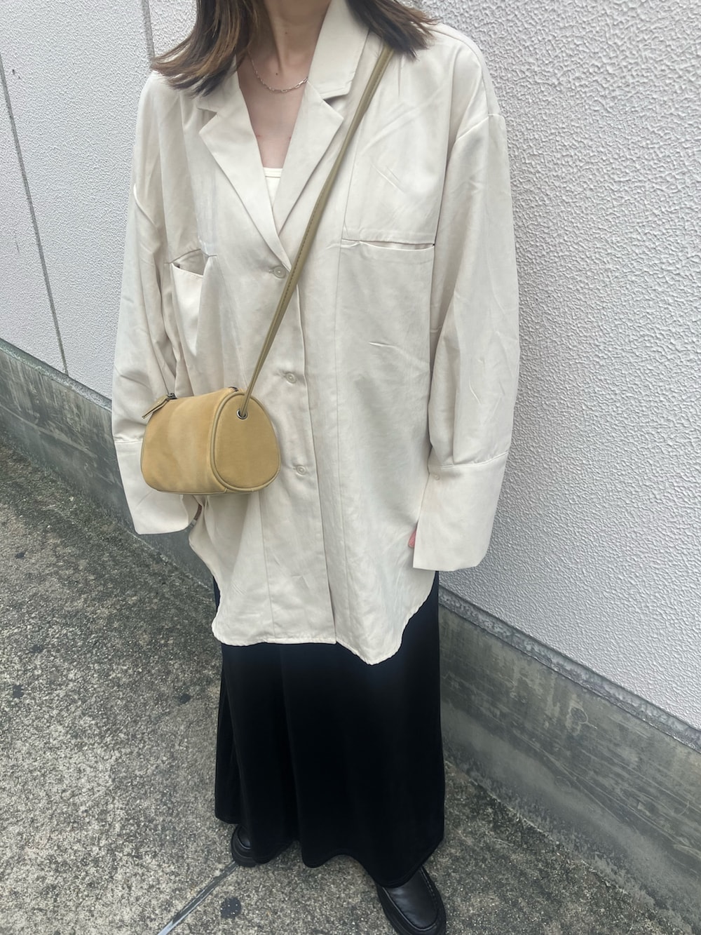 オーバーサイズのシャツにタイトスカートを合わせてバランスよく!!シャツはジャケットみたいな襟なのでおしゃれ感が増すアイテムです!!