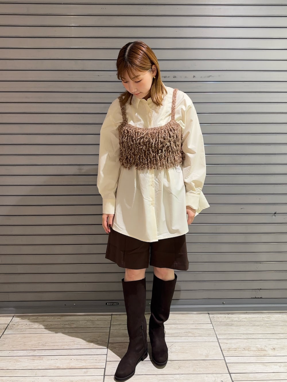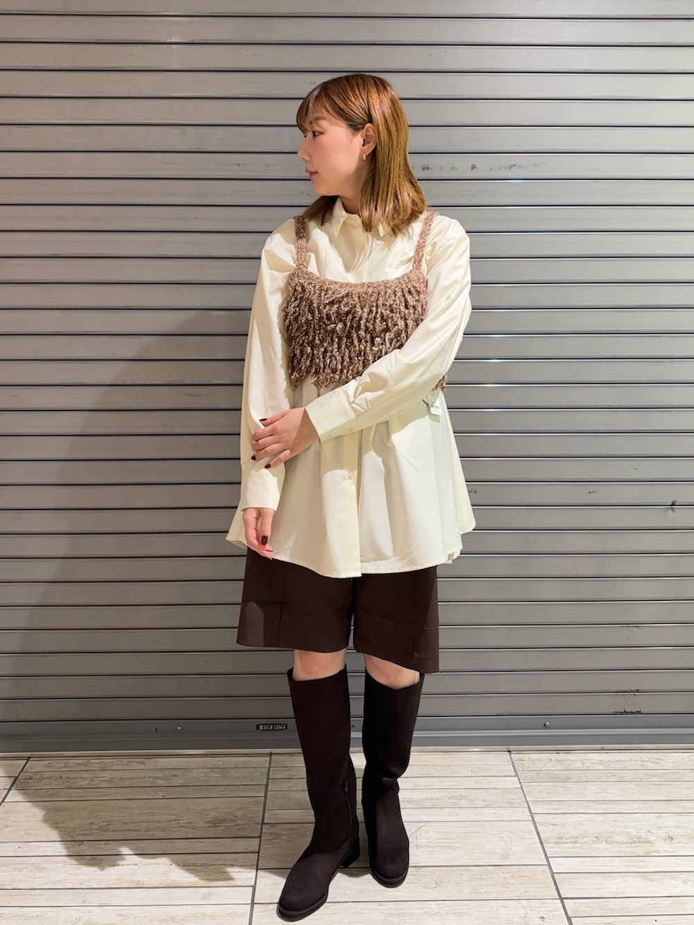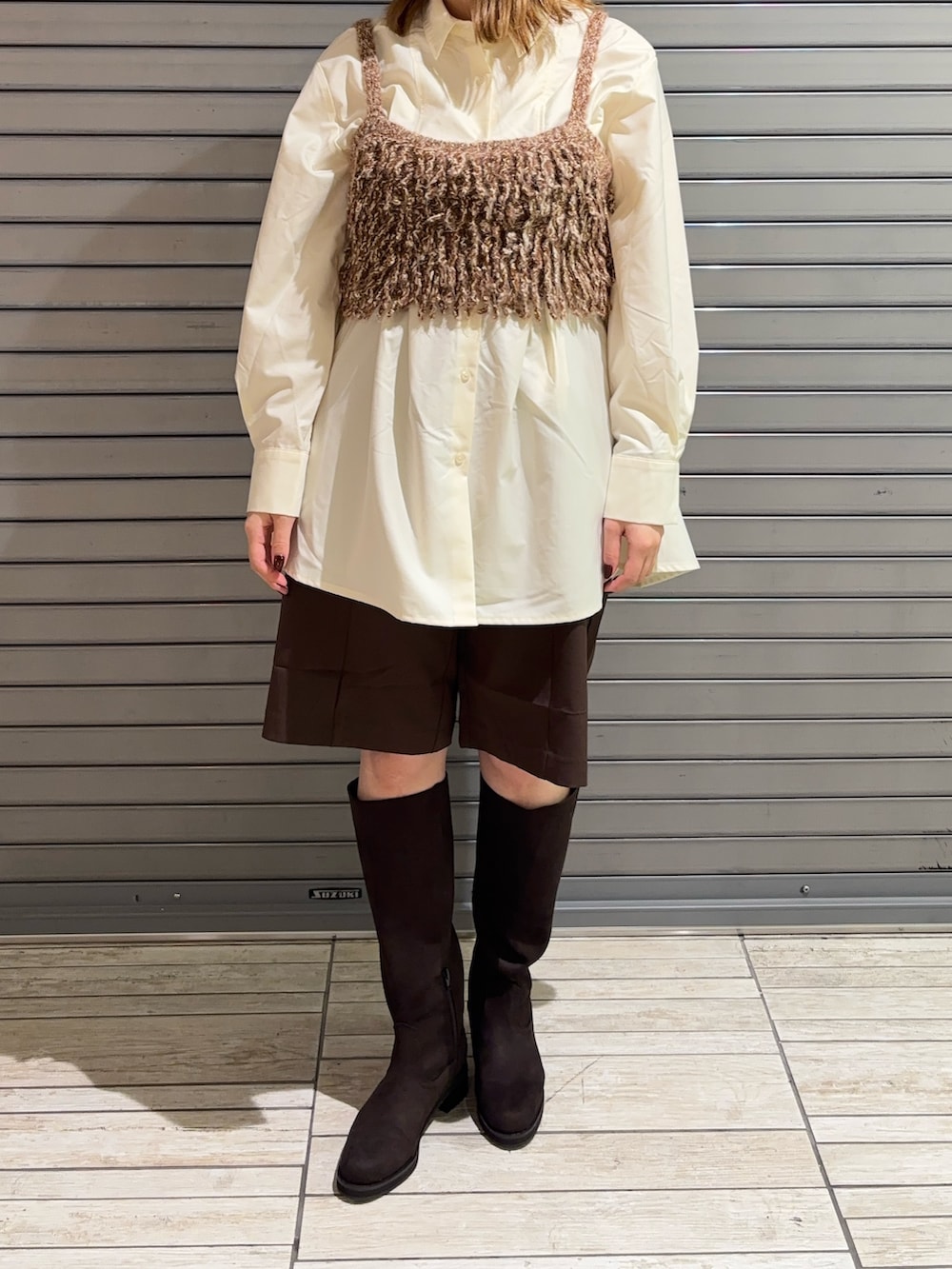 シャツにニットビスチェを合わせて秋っぽさをプラス。