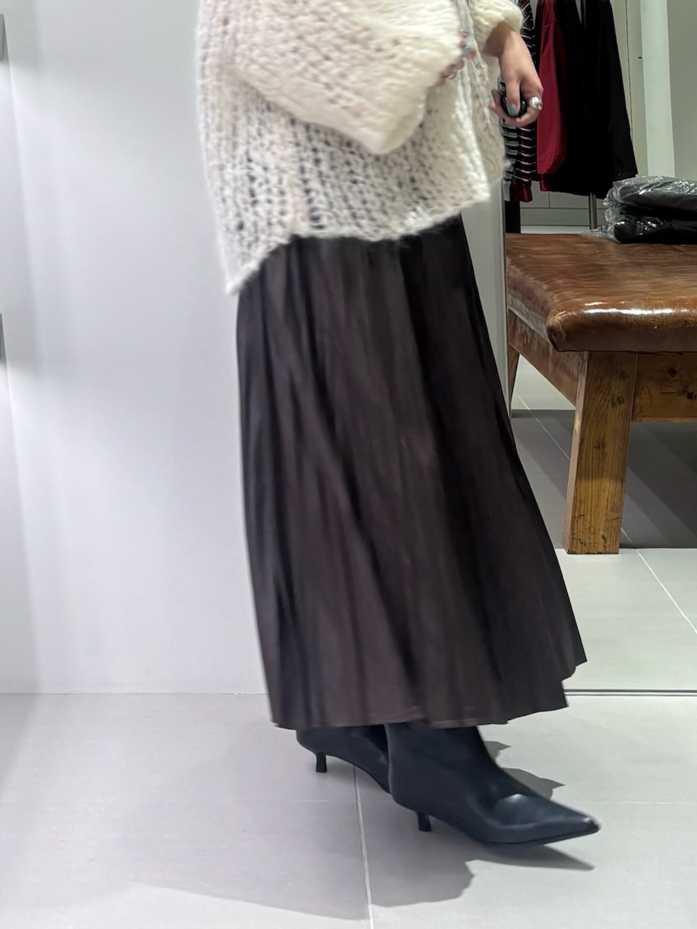 ニットと合わせてもマットにならないのでメリハリのあるコーディネートにできて便利です。