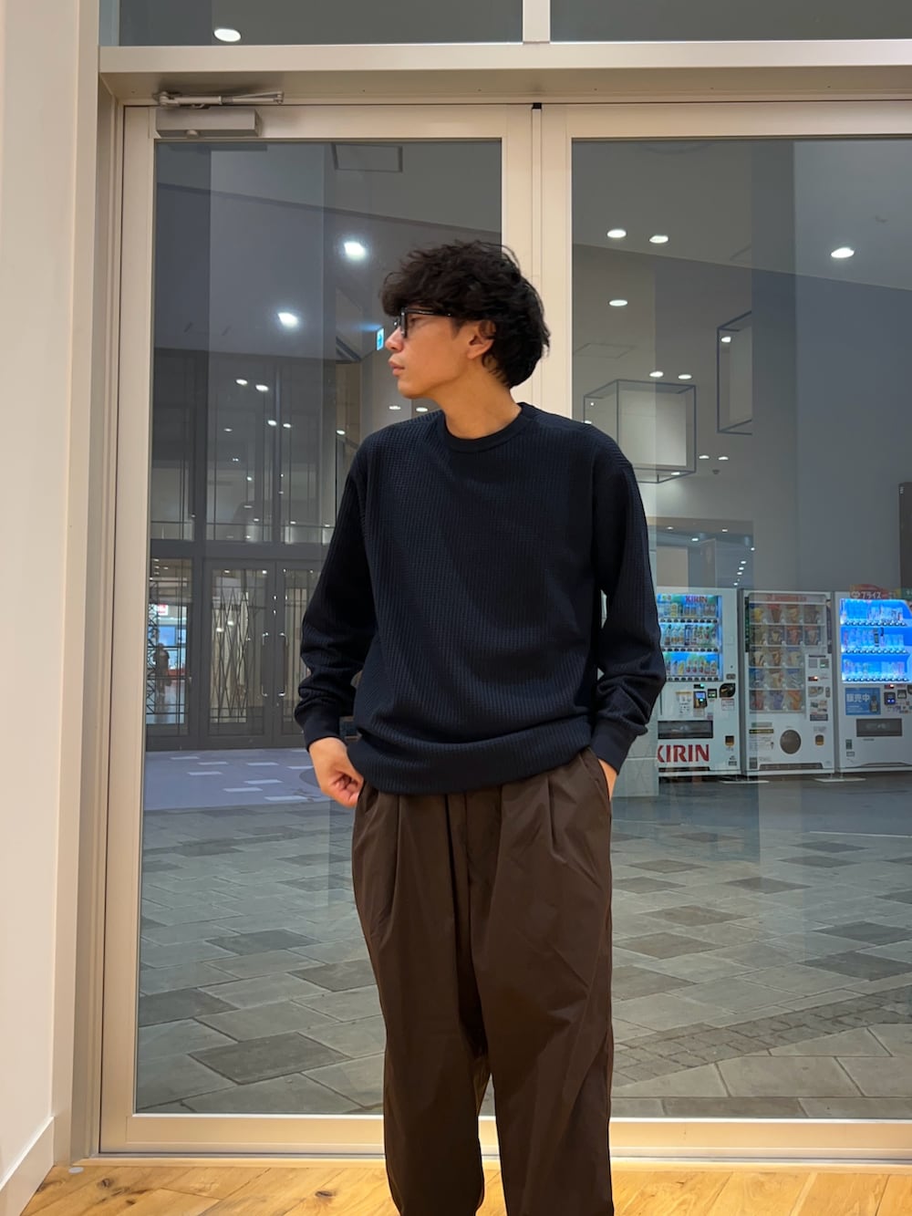 ワッフル生地で柔らかいのでナイロンパンツを合わせて全体的にやさしい印象に!