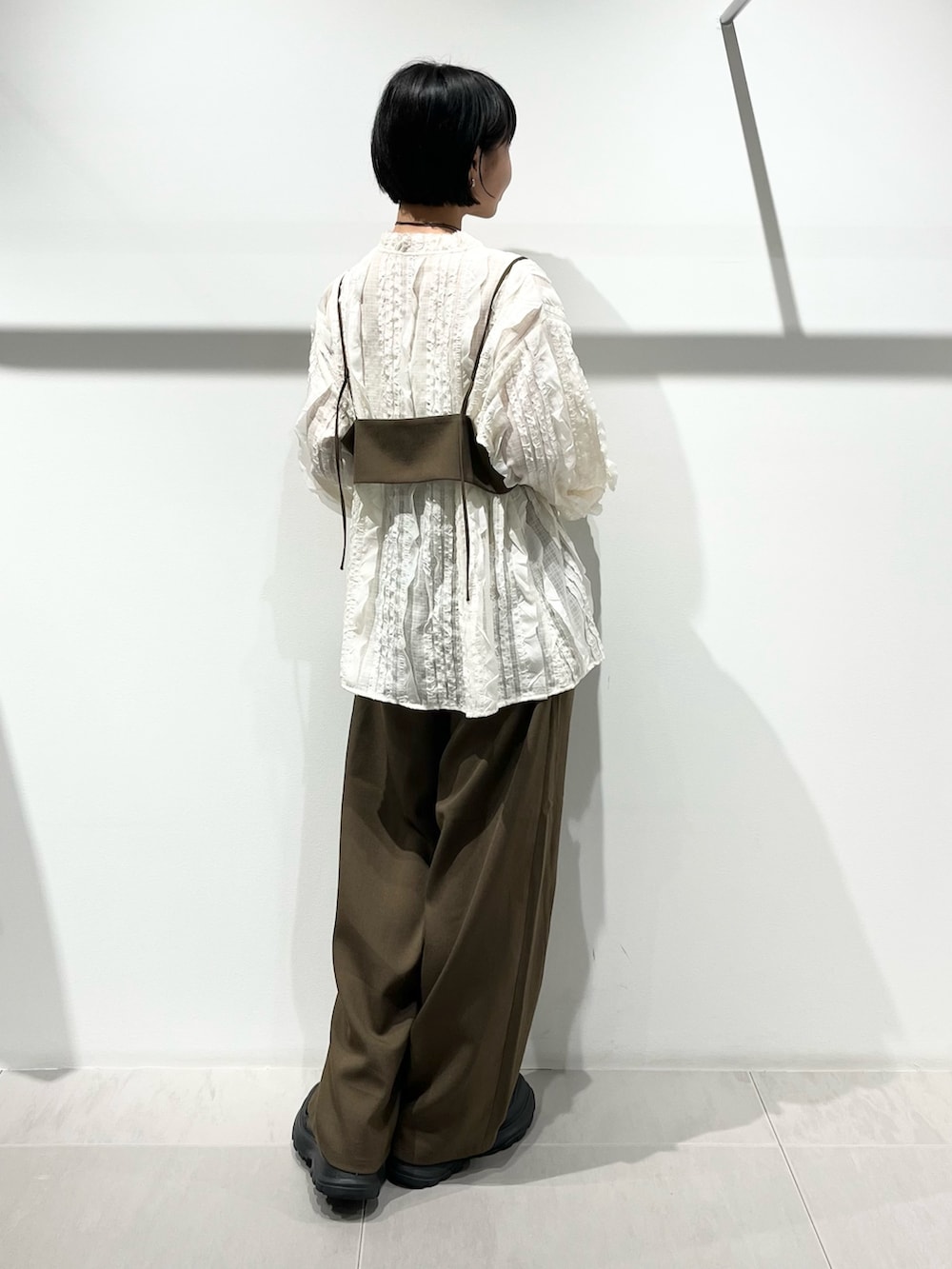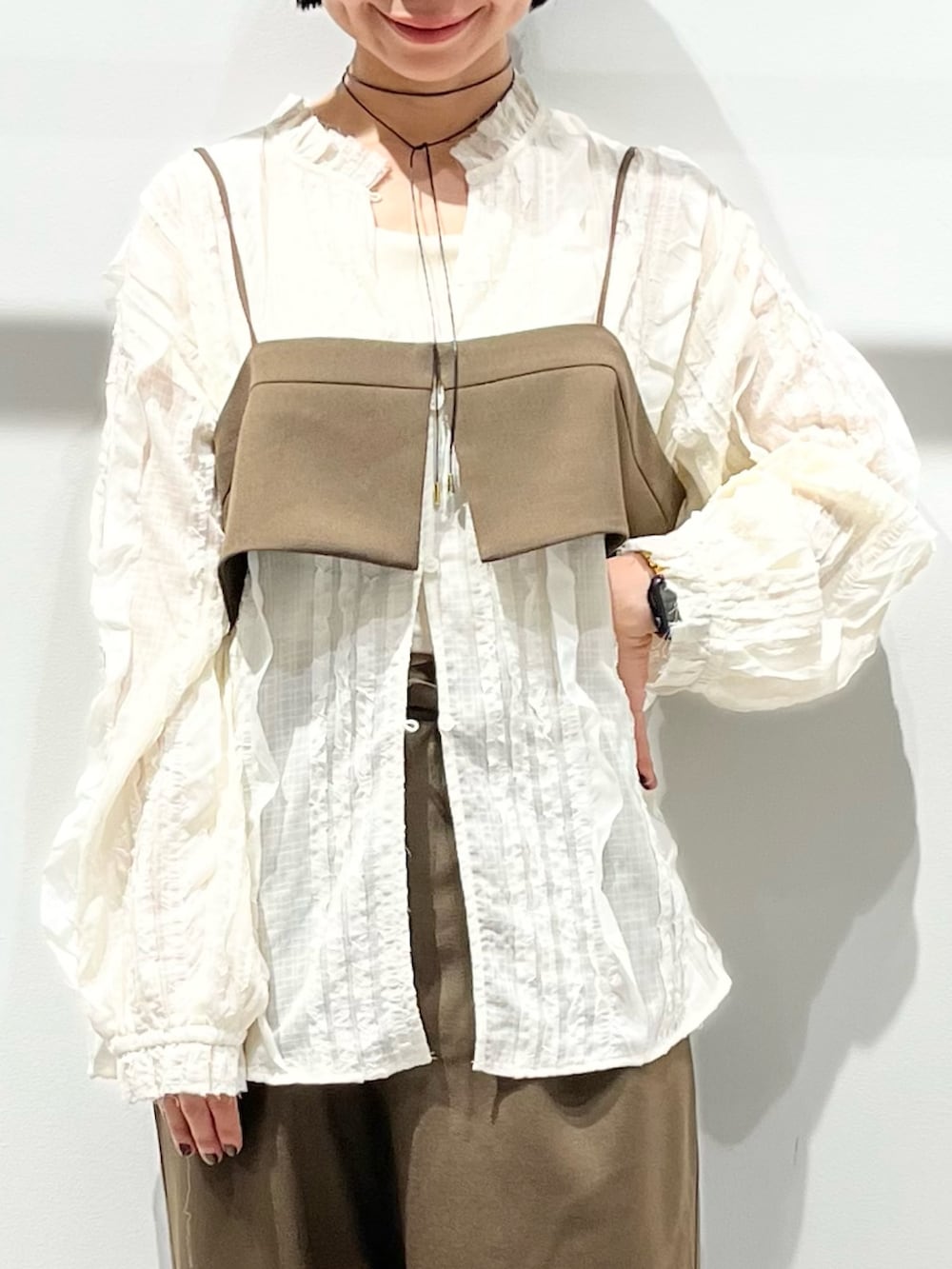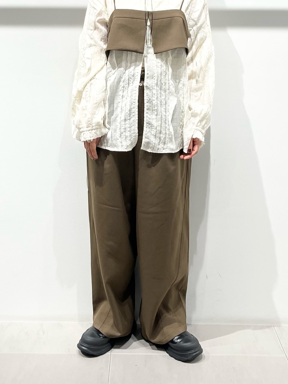 ジャケットとセットになっているビスチェは秋にTEEやシャツと合わせるとちょうどいいです。セットアップのパンツできちんと感を出しました。