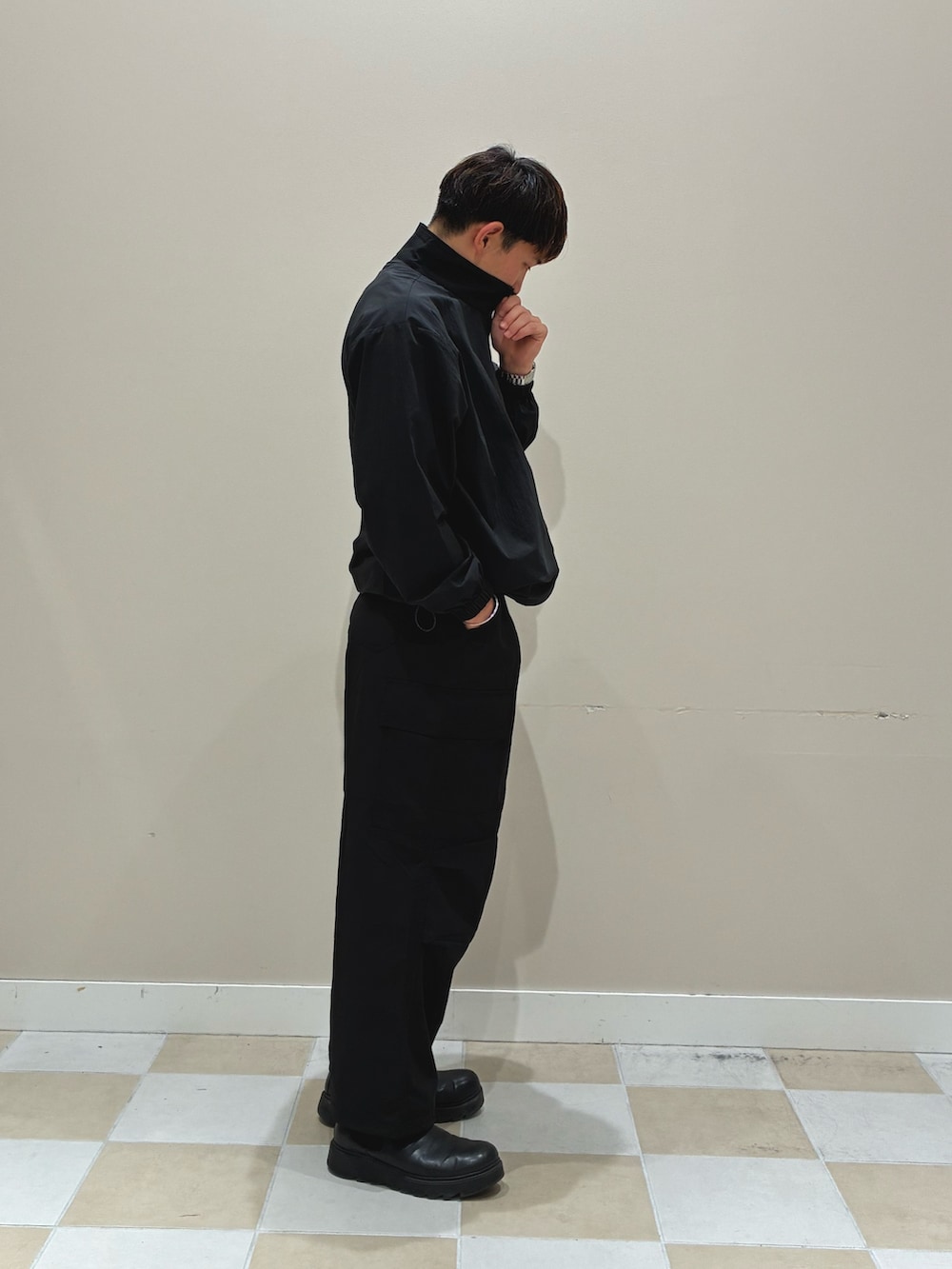 ナイロン素材のジャケットとカーゴパンツを合わせた、無駄のないオールブラックスタイル。