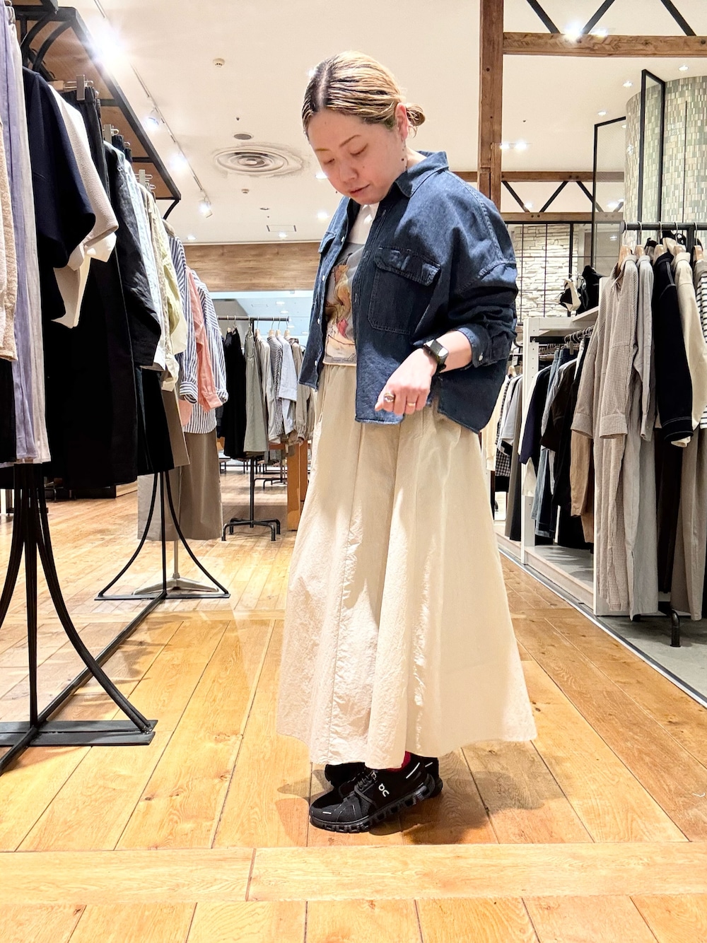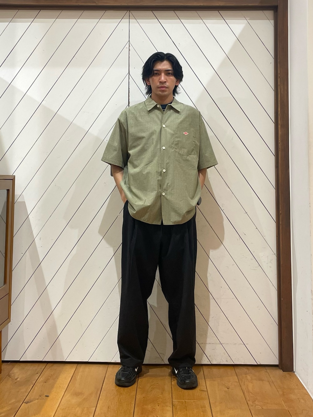 ジャケットとパンツが暗色で重たくなりがちなのでインナーは白にしました。各アイテムに茶色が入ってるので統一感があるのではないでしょうか。