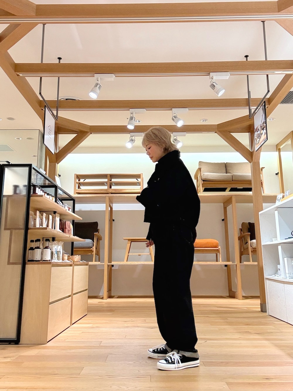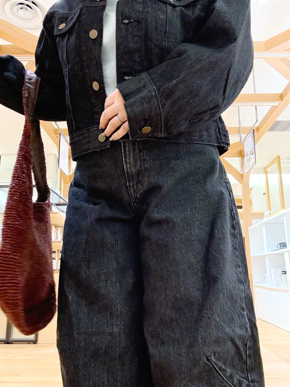 ブラックのデニムジャケットとデニムパンツのセットアップコーデにしました。デニムジャケットの丈感とカーブデニムがお気に入りです!重くなり過ぎないようにライトブルーのTシャツを合わせました!