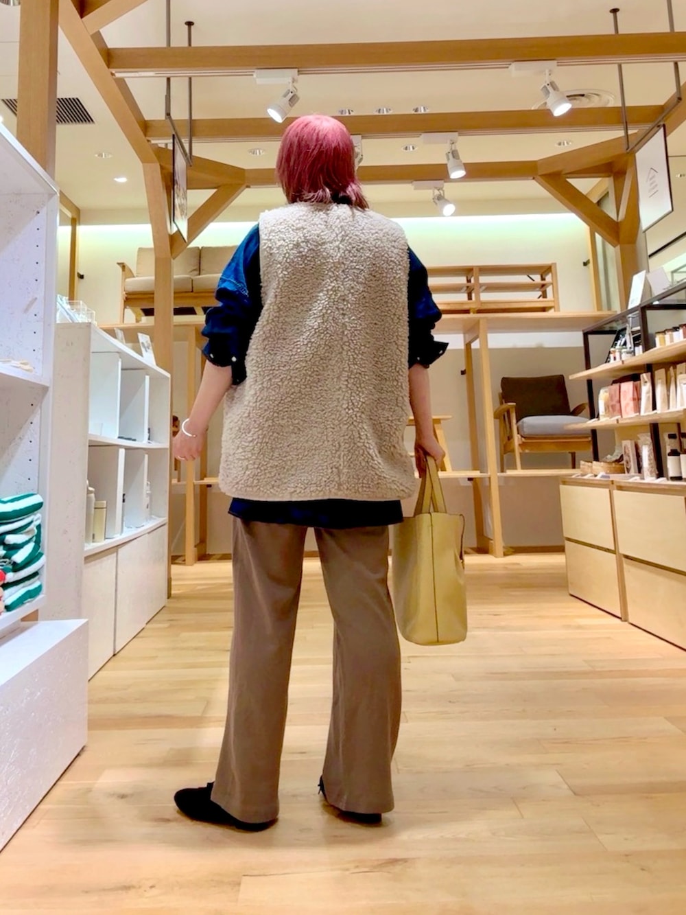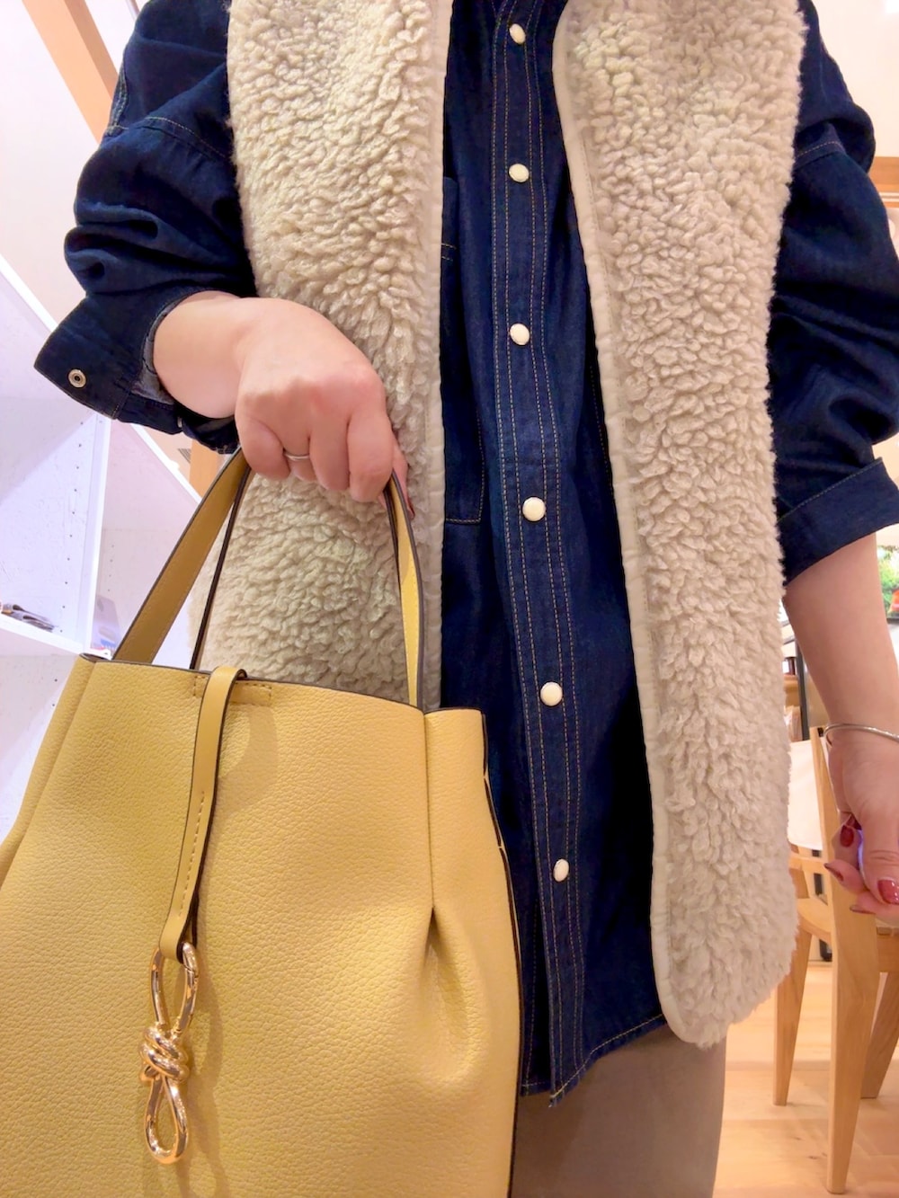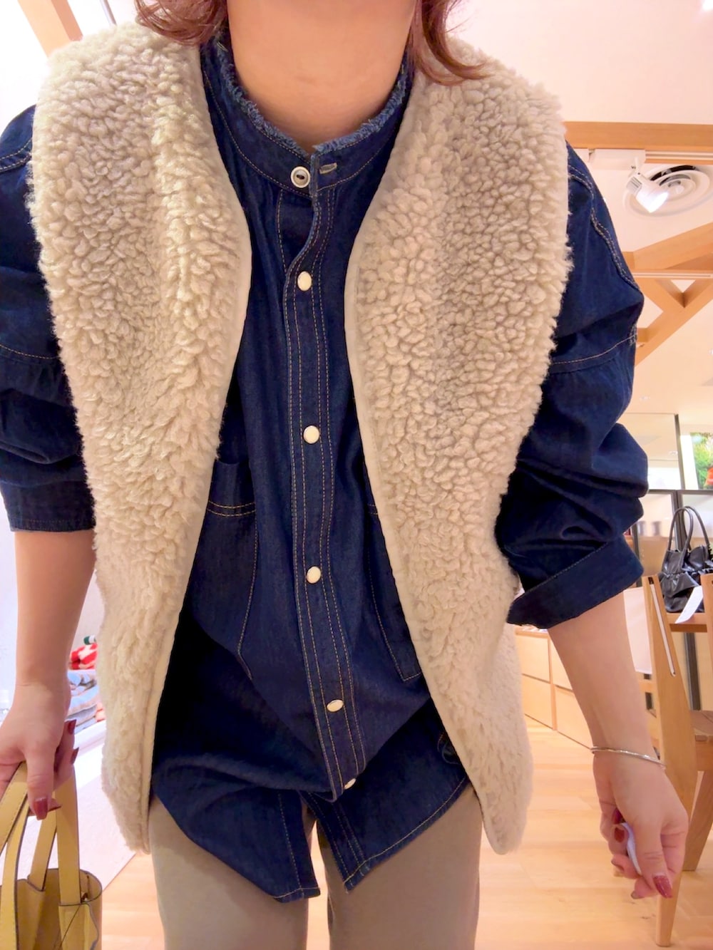 少しオーバーサイズのデニムシャツは、お尻が隠れる嬉しい丈感です。シャツだけでもシルエットがキレイなので1枚で様になるところがお気に入りです!パンツはウエストゴムのイージーパンツを合わせて楽ちんでもキレイなシルエットコーデにしました。秋っぽさを出すためにリバーシブルのボアベストとイエローのバッグを合わせました。着膨れしないボアベスト、おすすめです!