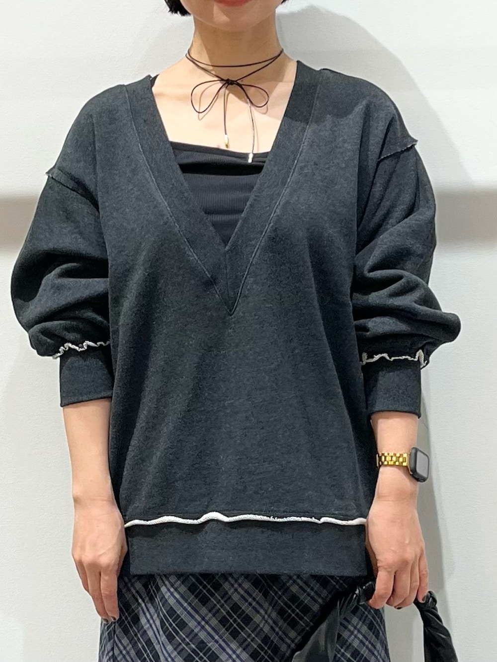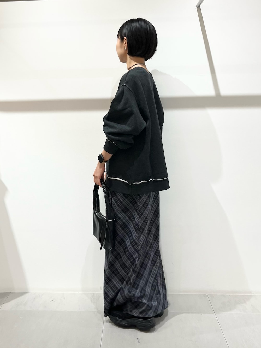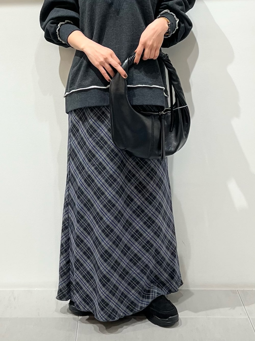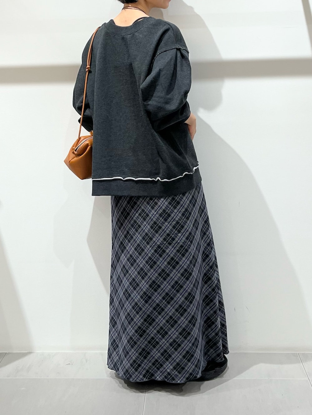 ルーズなシルエットのスウェットは肩を落としても抜け感が出て可愛いです。スカートはすっきりしたシルエットで、トップスにボリュームがでる秋冬にかけて合わせやすいですよ!