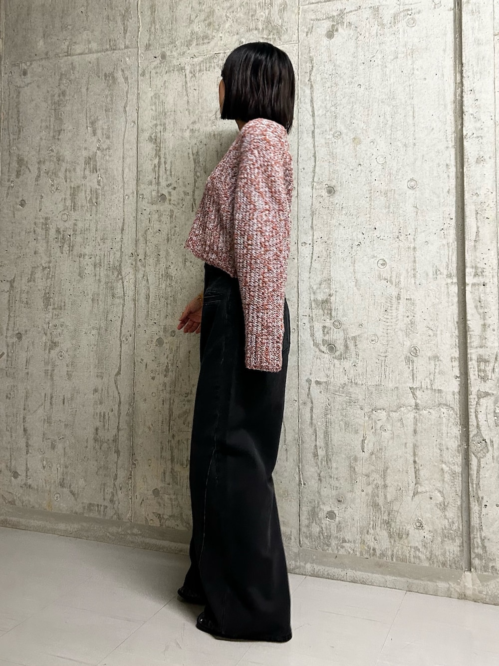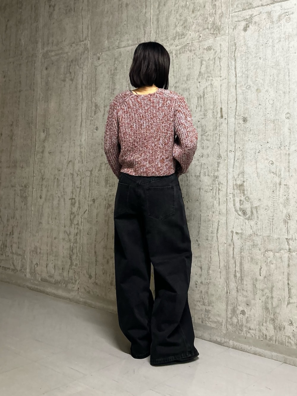 ブラウンに水色の糸がまざったニットが主役のコーデです🐈🤎🩵