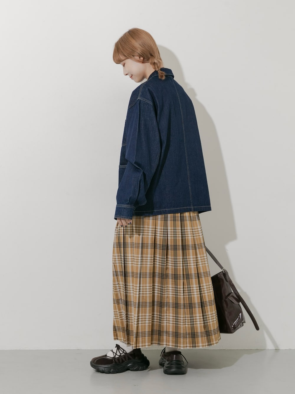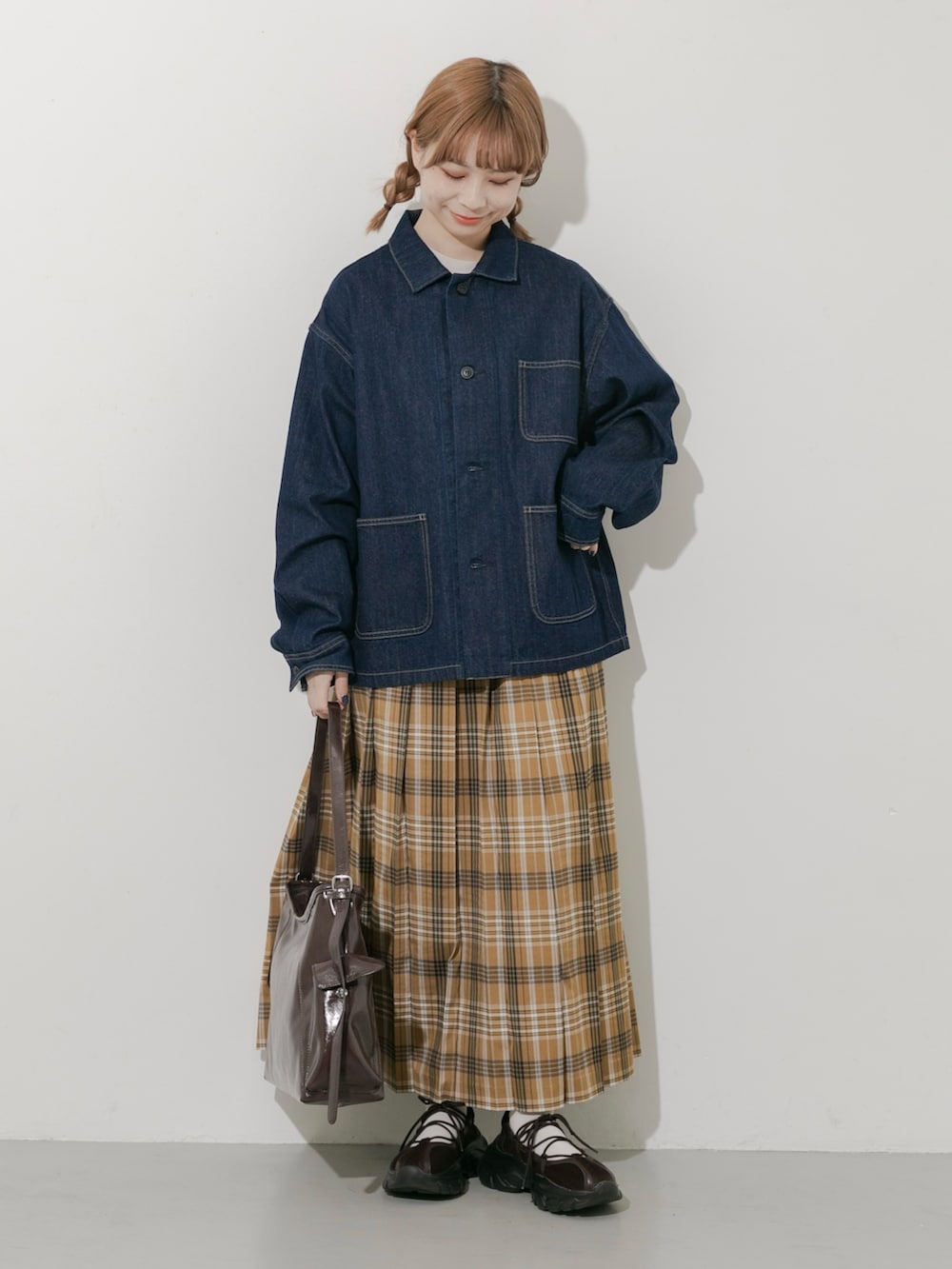 派手に見えすぎない落ち着いたイエローのチェックスカートで、一気に季節感あるコーデに。