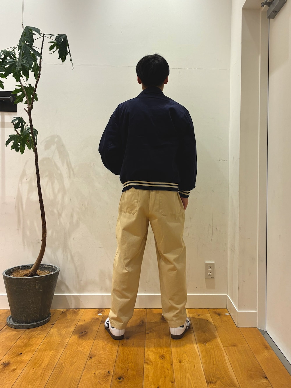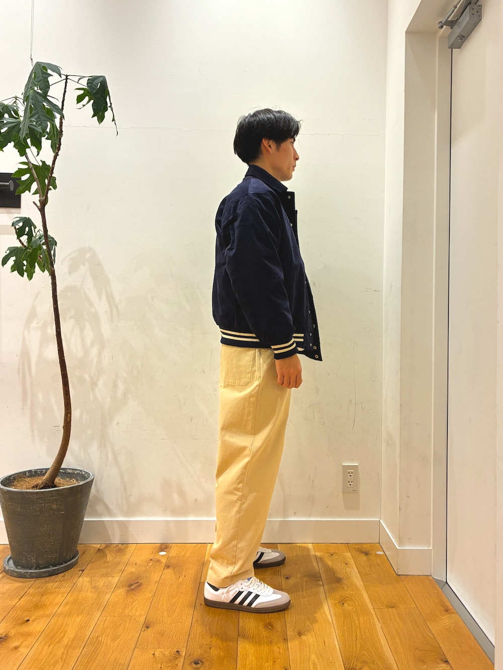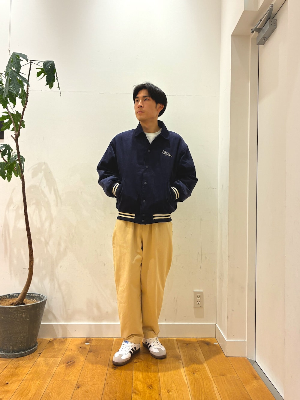 アメカジ風コーデになっています!スタジャンのような作りでゆったりとしている為、寒い時は中に着込むことも出来ます!パンツはジャケットが暗い為明るめかつゆったりとした物にしてみました!靴やロンTはジャケットに白が入っている為白色にしました!