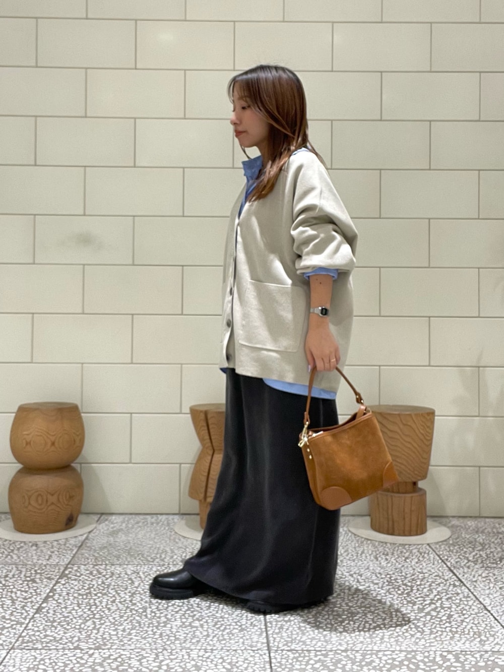 大きめのカーディガンはボリュームのあるトップスの上からでも羽織やすいので