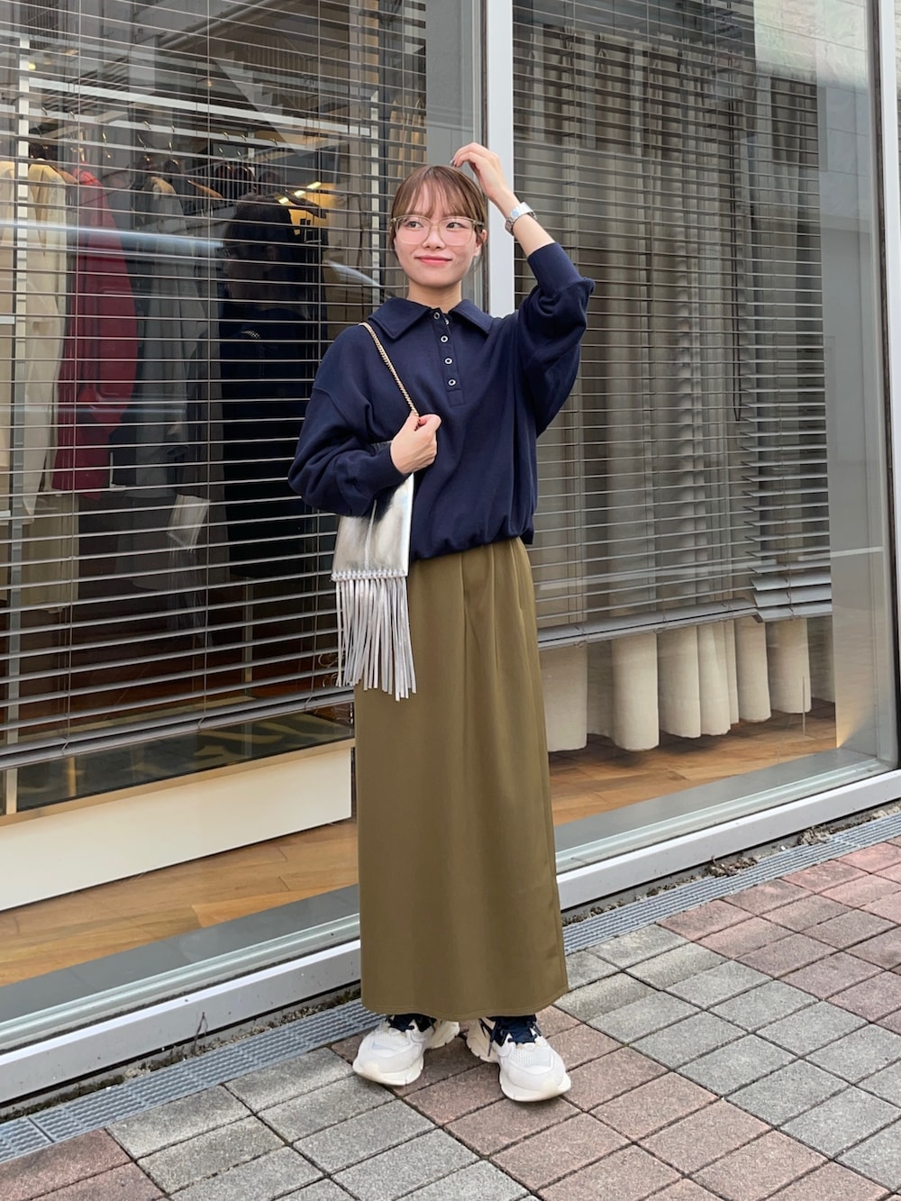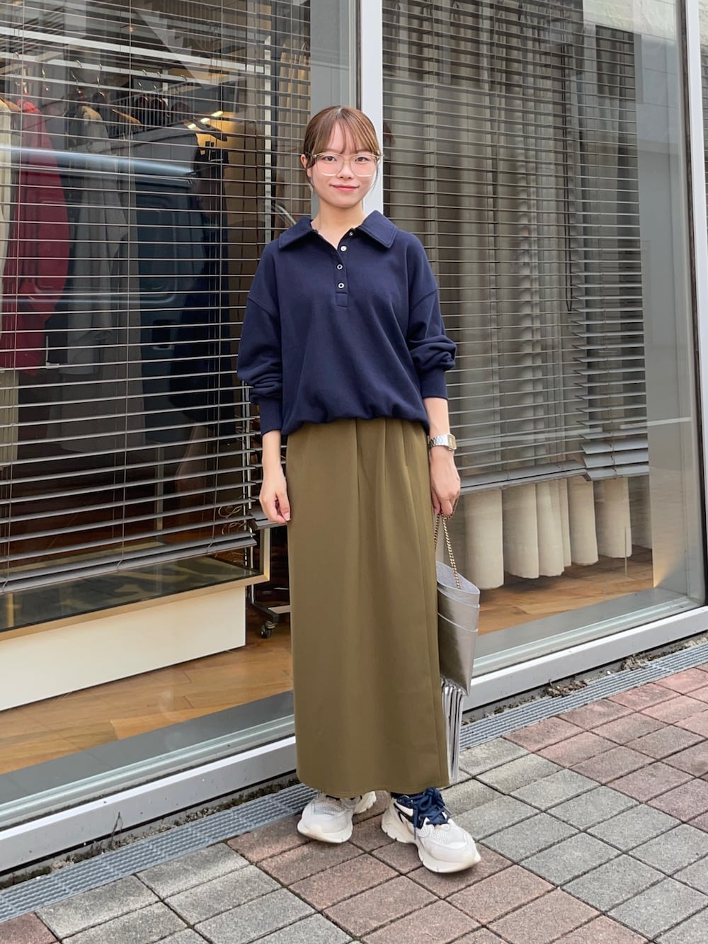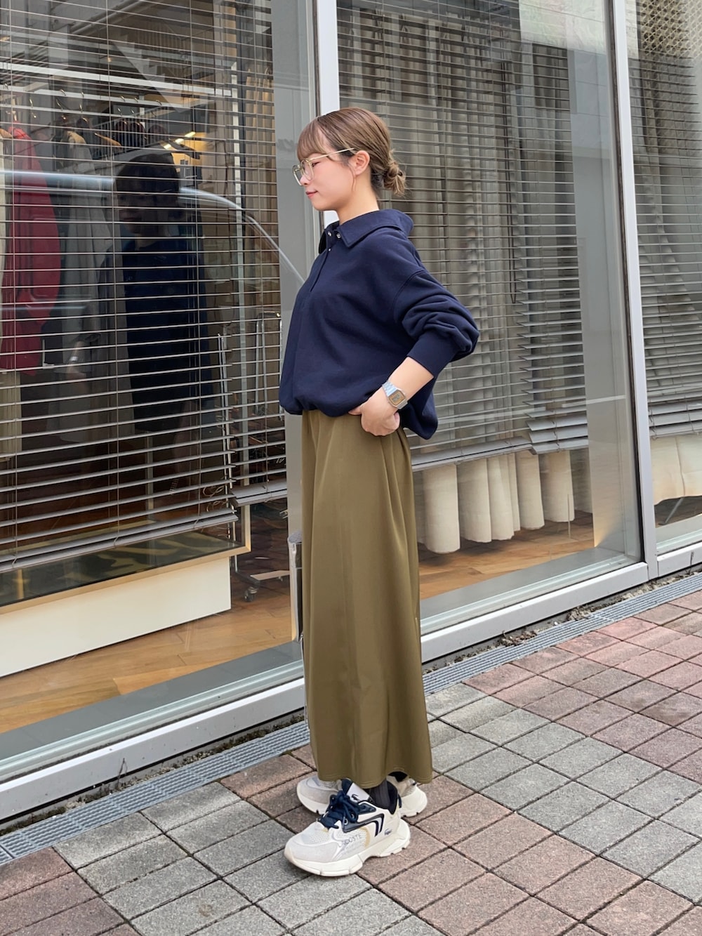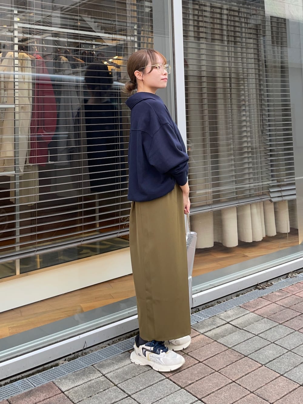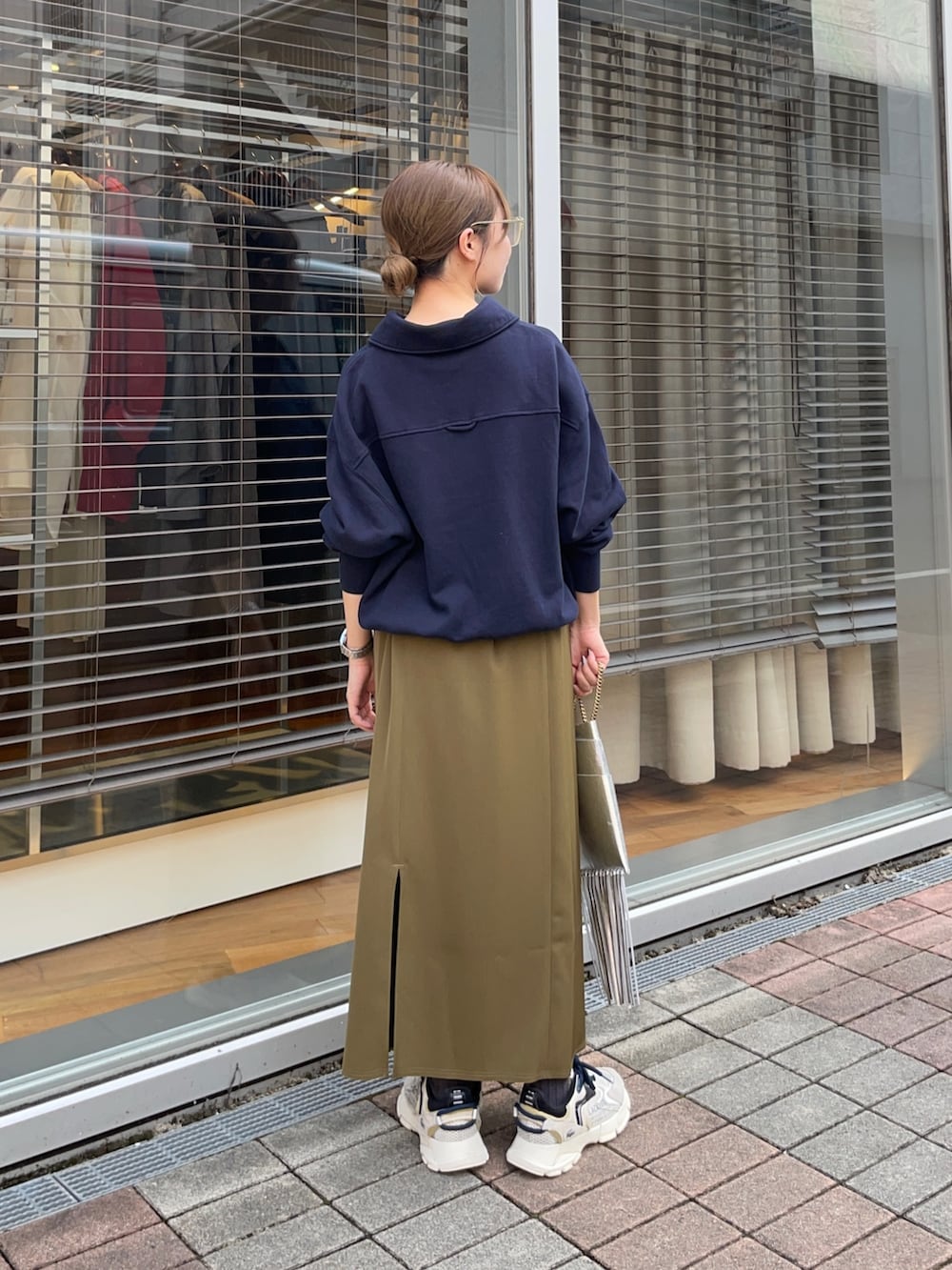スカートは低身長でも着れる短めなストレートスカートです!キレイめにも使えるアイテムですが、あえて足元にスニーカーを履いて合わせても違和感なく使えました!✨