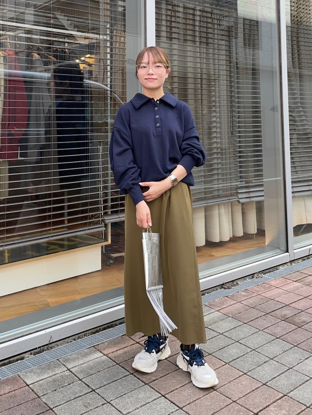 トップスのスウェットは襟がついたカジュアルだけど、シンプルすぎないデザインがポイントになるアイテムです!ボタンも付いているので、上から2個ほど開けて着ると、抜け感も出てオススメですよ!カットソーを重ねてインナーに入れるのも合うと思います◎