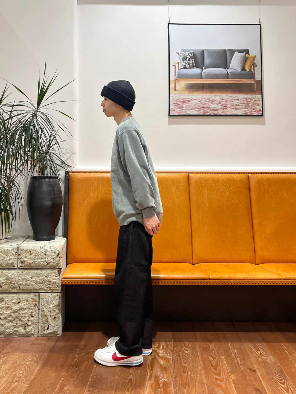 横幅の広いニット帽で見た目を可愛らしくしてトップスグリーン系で色をつけて、パンツはシンプルなデニムで合わせています。