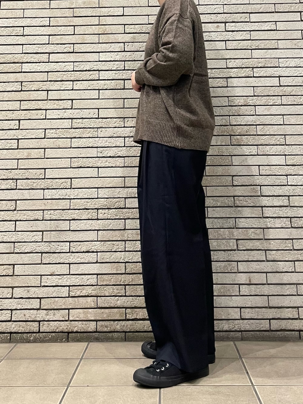 今回はスラックスと合わせて、キレイめシンプルな装いです。パンツのウエストはゴム仕様で楽に着用いただけます。