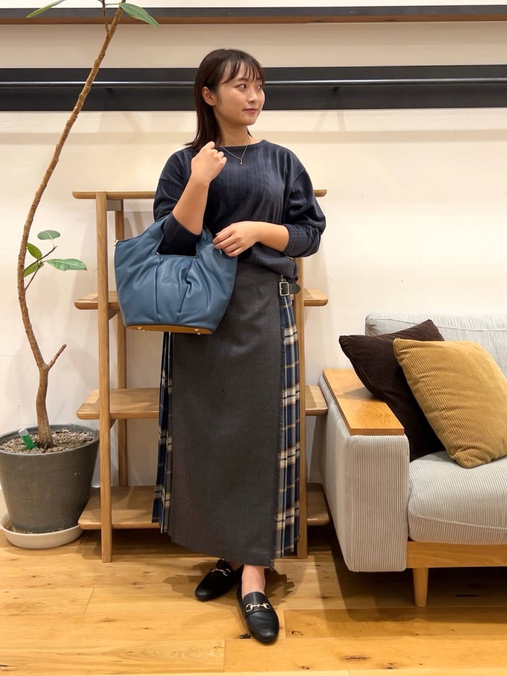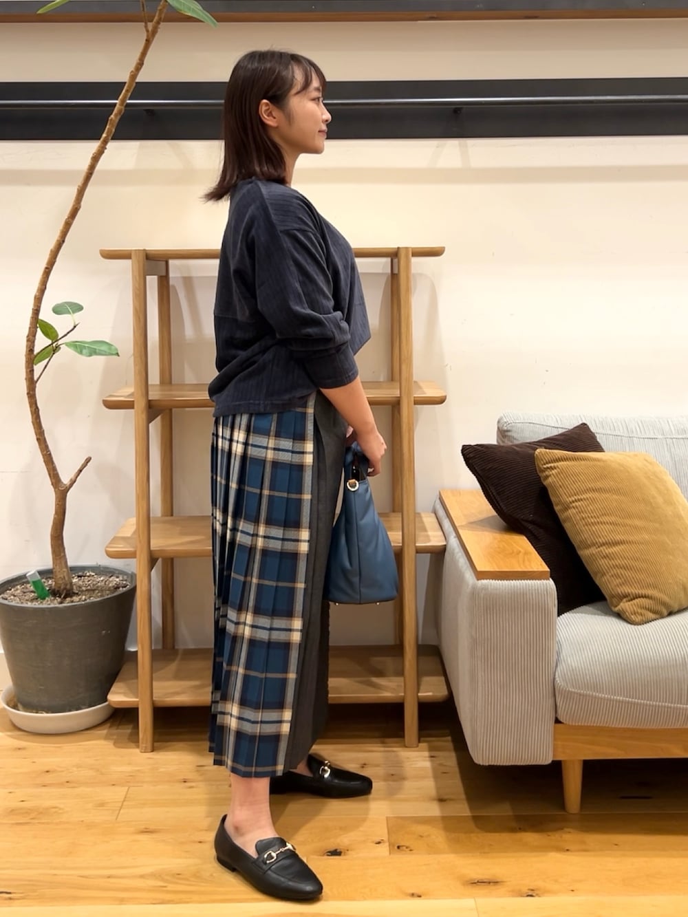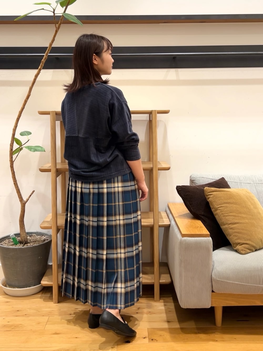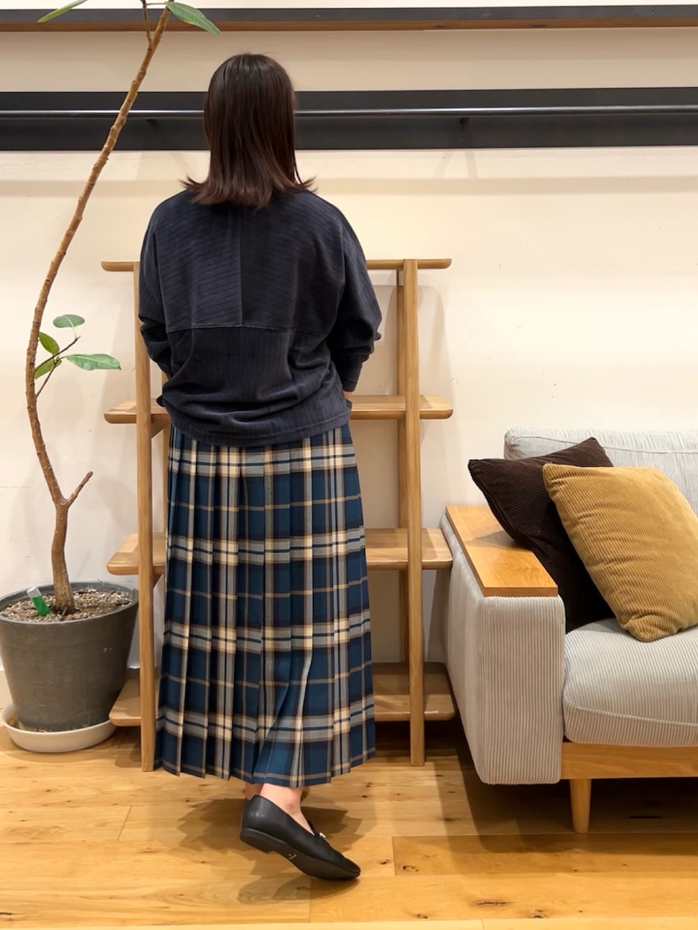 ラップスカートタイプで、一番短くベルトをとめて着用しました。プリーツが入ってますが、シルエットはゆったりしたストレートっぽく、あまり広がりは気になりません。