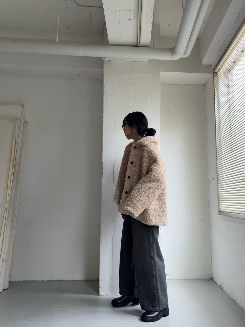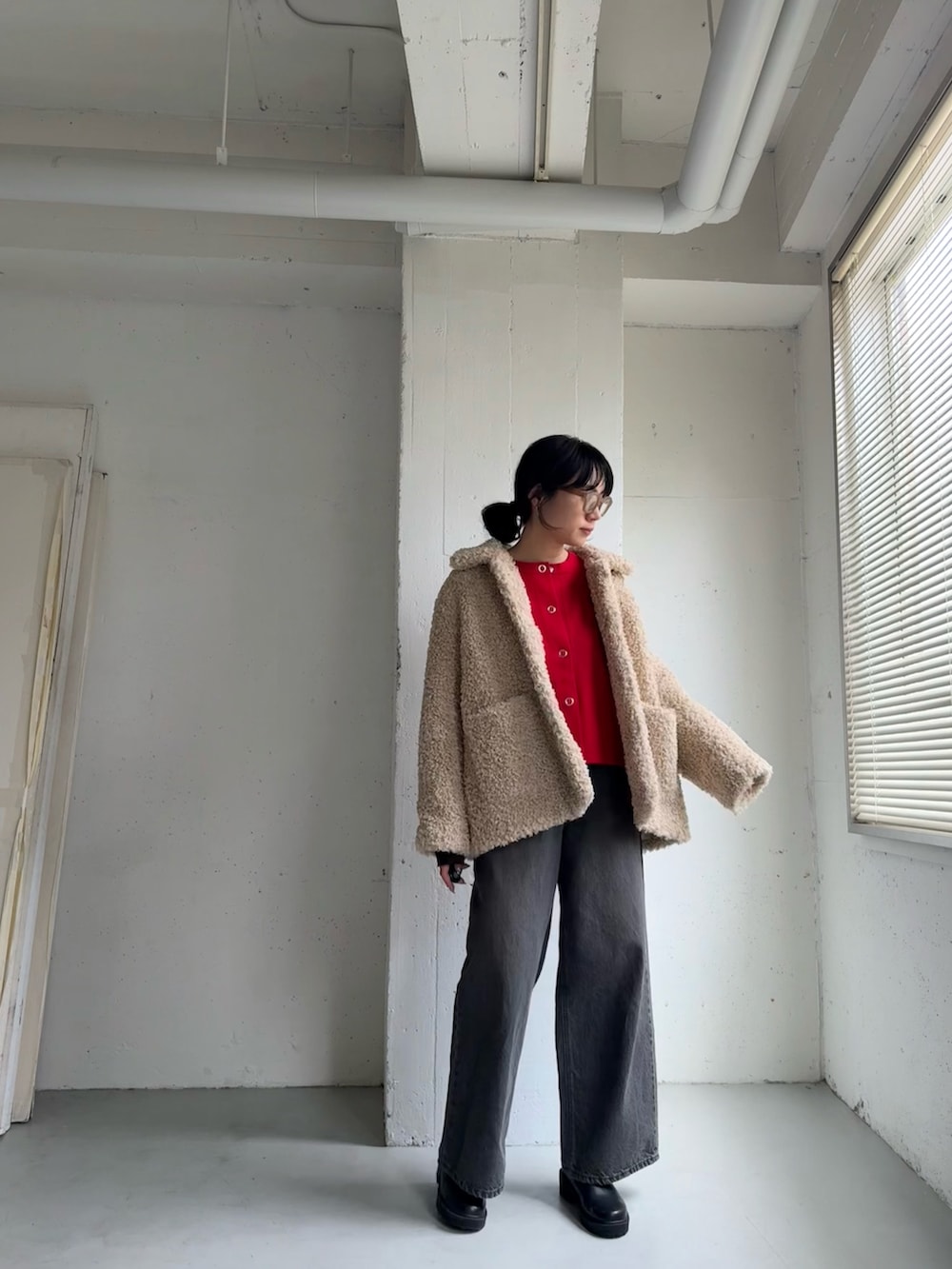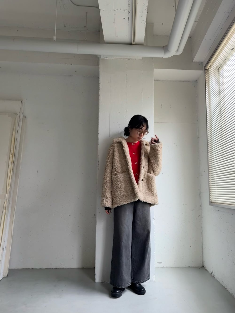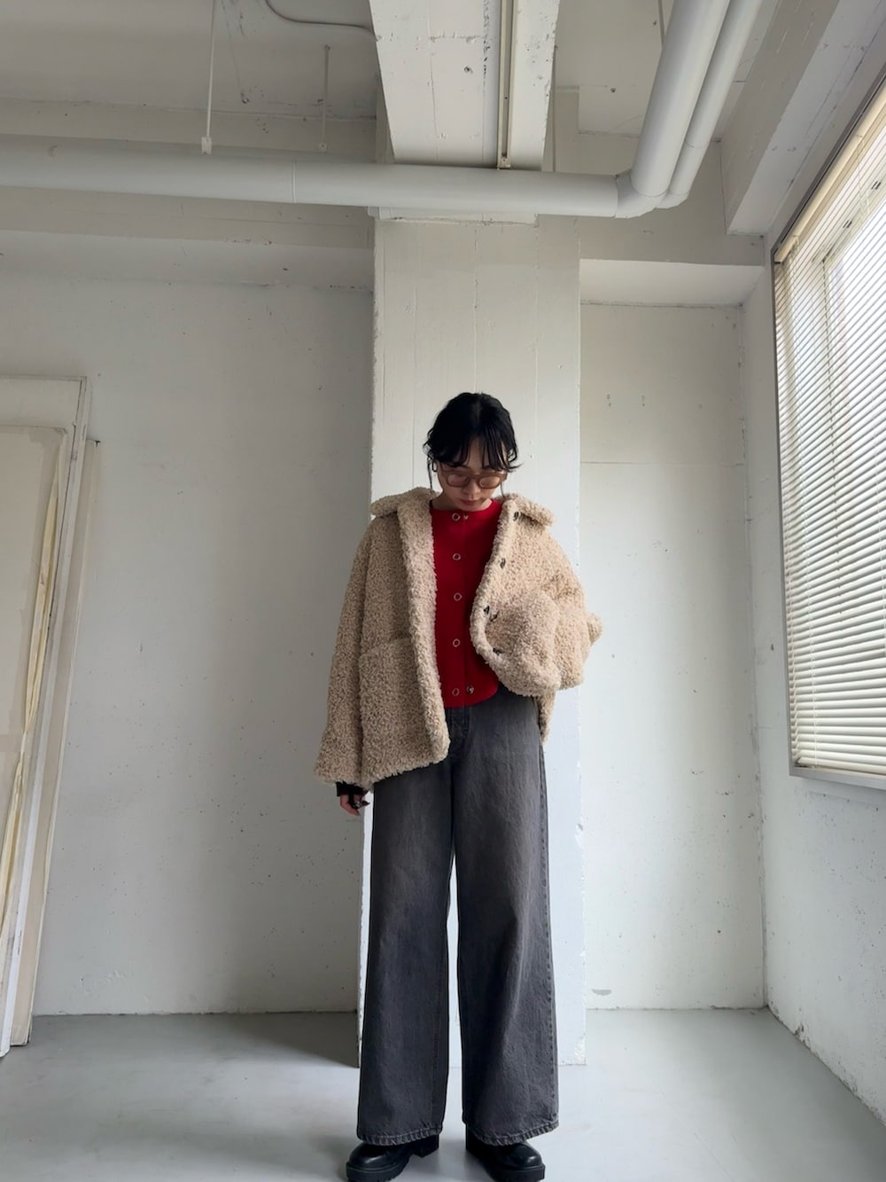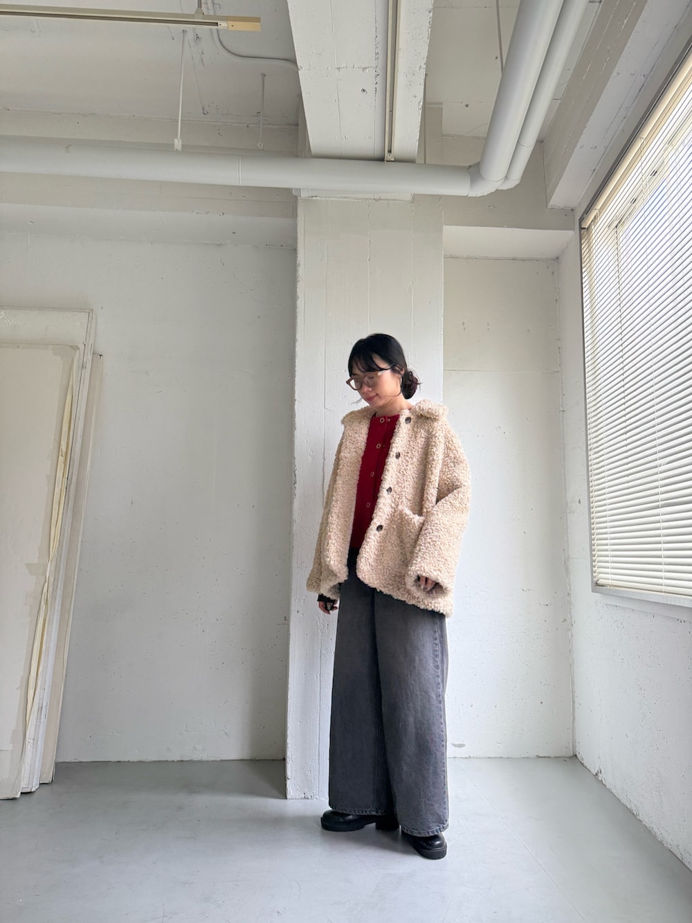 甘くなりすぎないようにボトムはブラックデニム、シューズはトラックソールでハンサムに仕上げました。