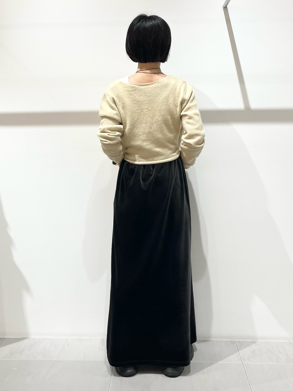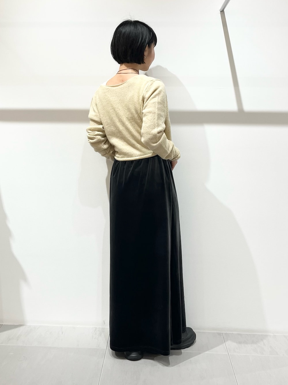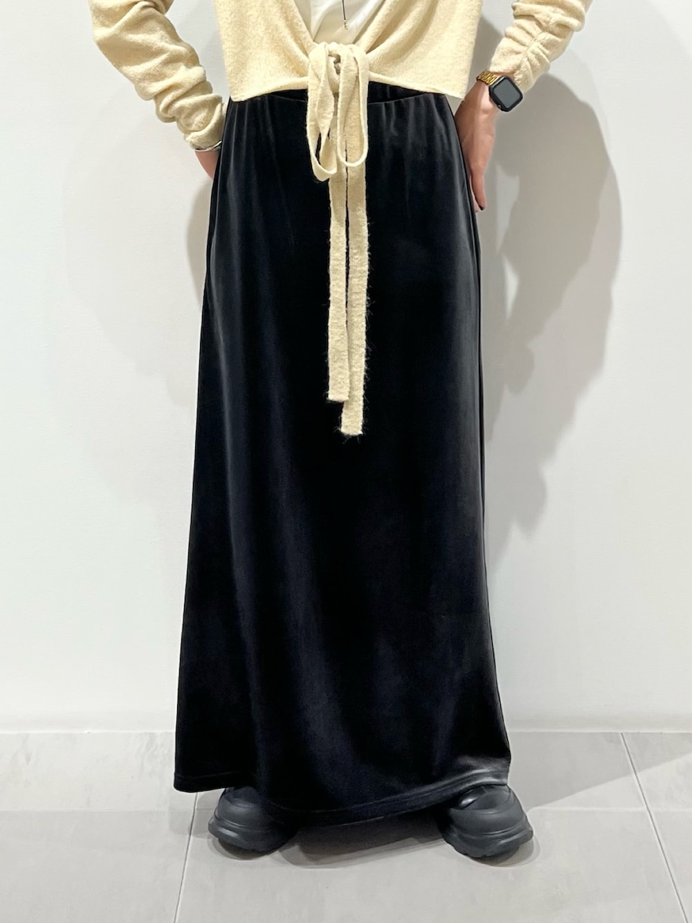 同系色のインナーとニットを合わせてすっきりまとめました。ベロアスカートはシルエットとてもきれいで履きやすいです!