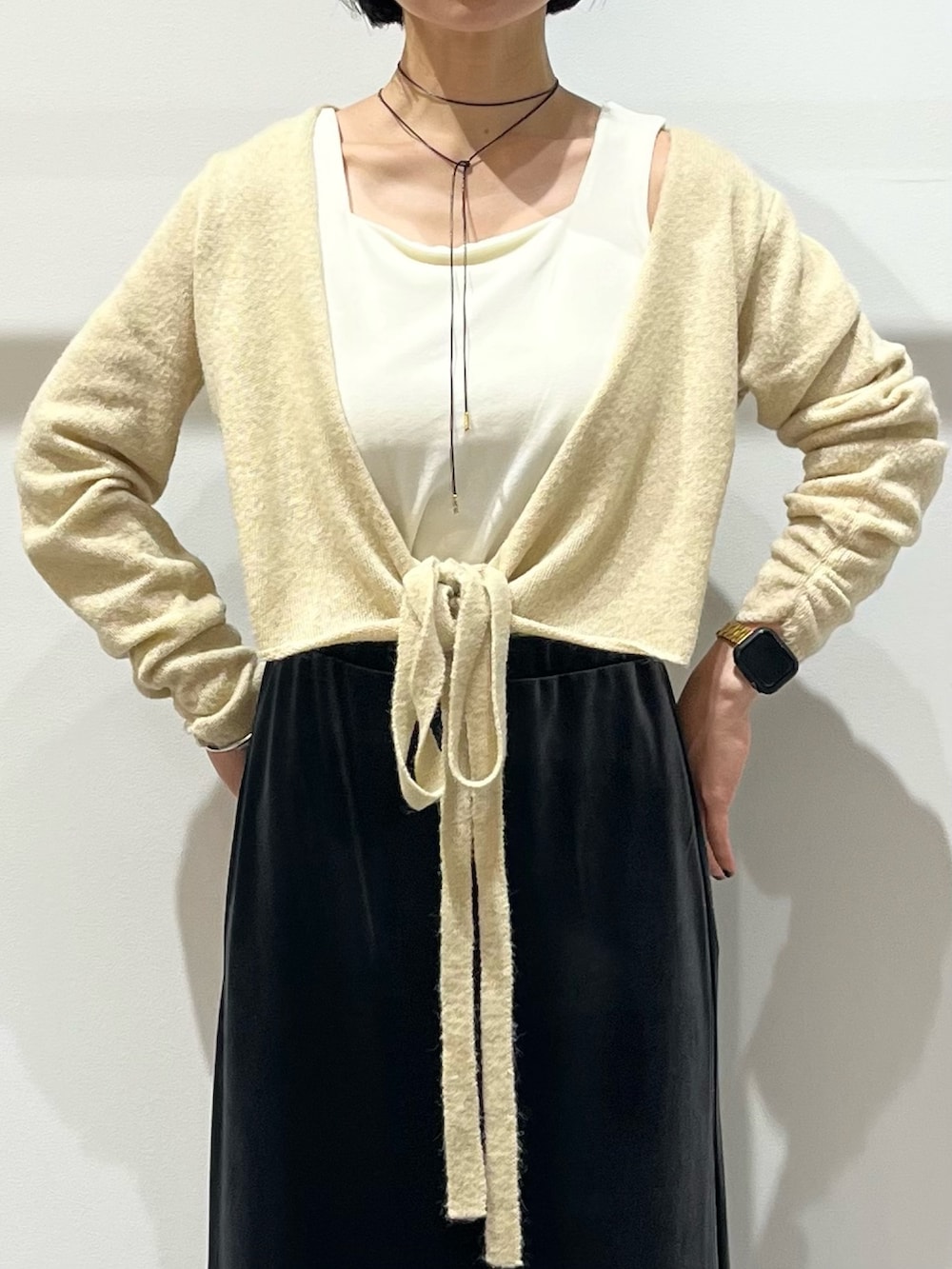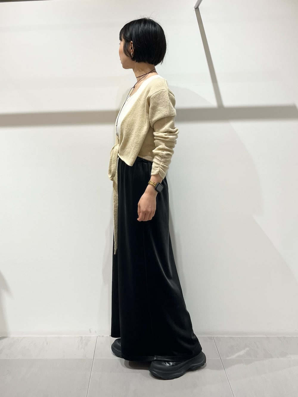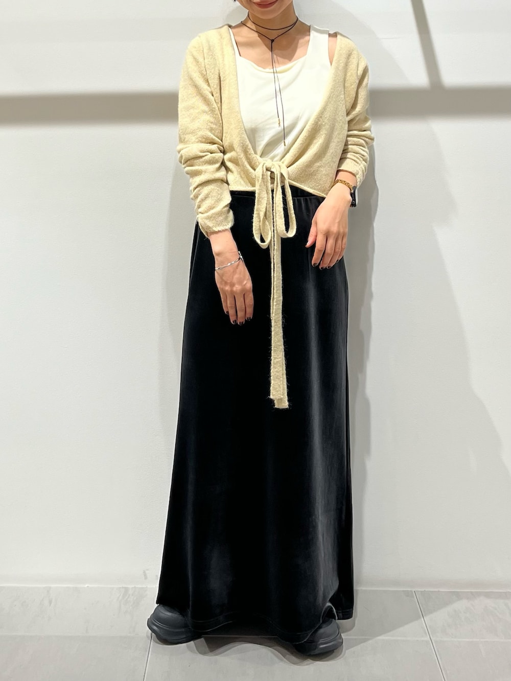 同系色のインナーとニットを合わせてすっきりまとめました。ベロアスカートはシルエットとてもきれいで履きやすいです!