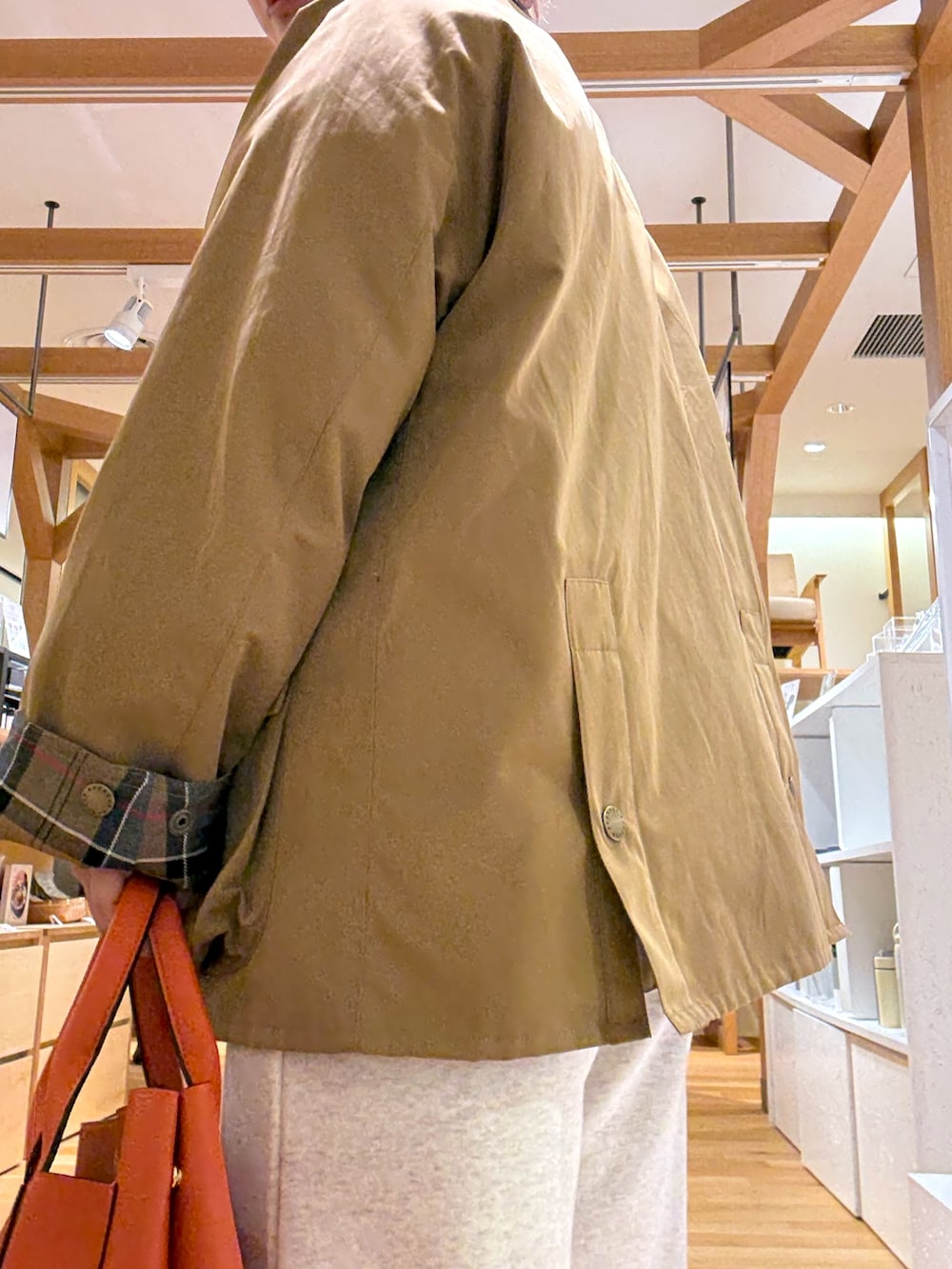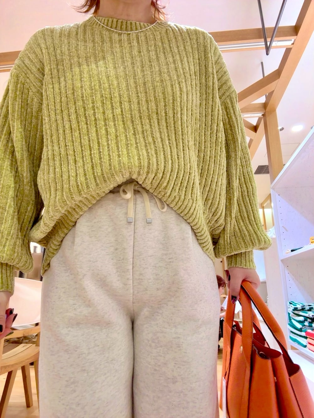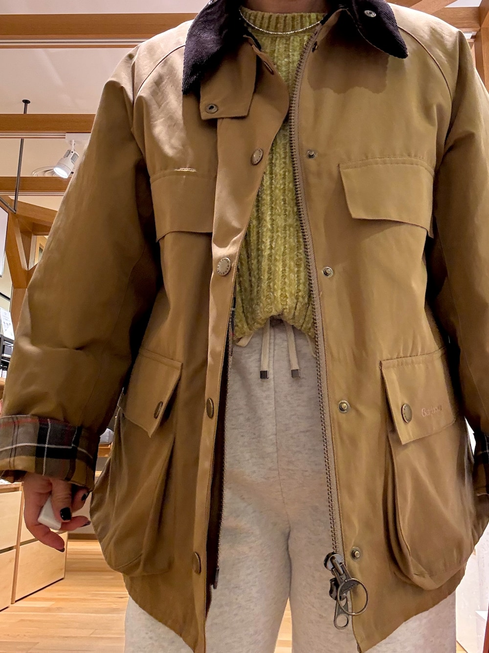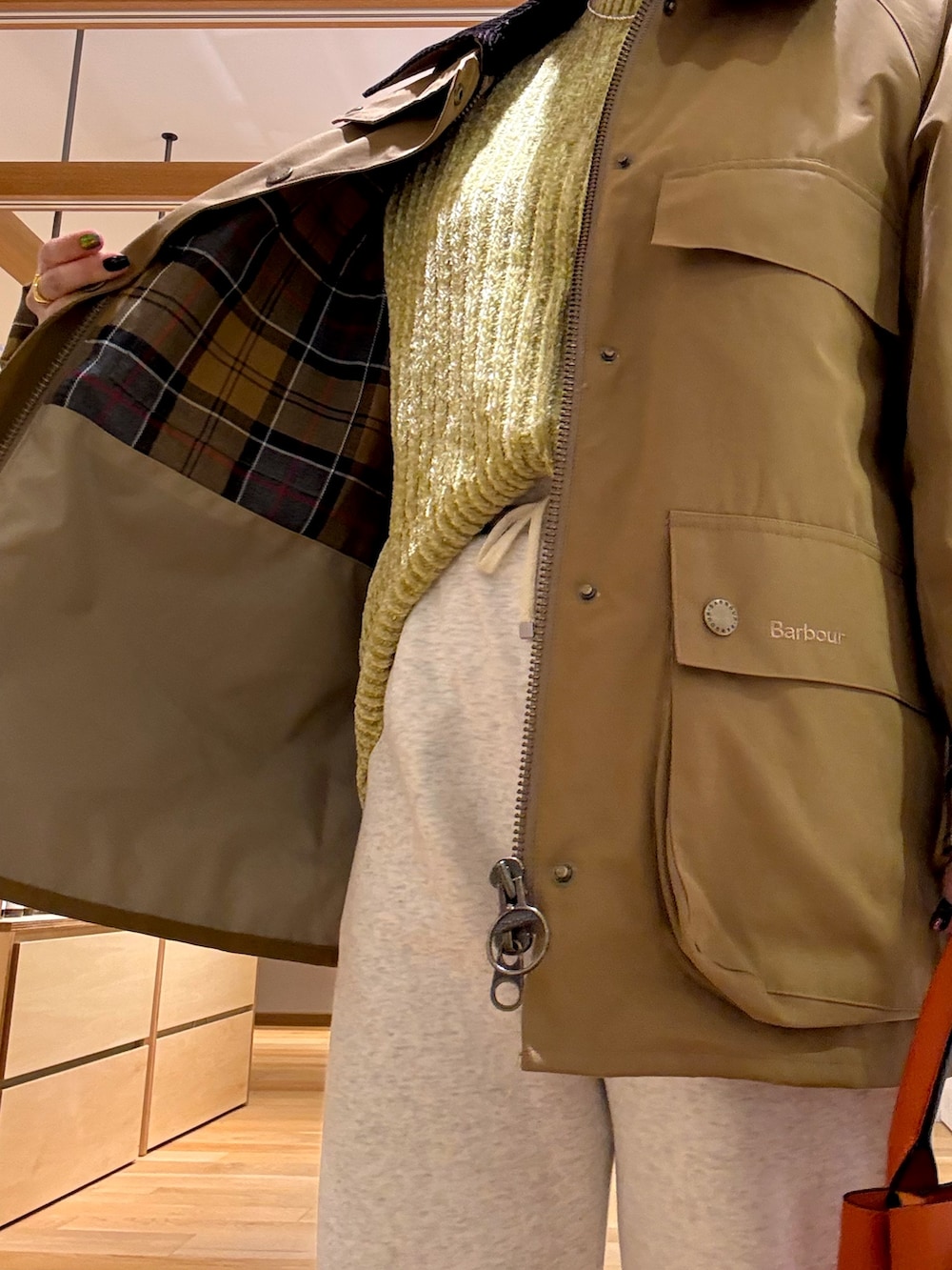 今年も可愛いBarbourのジャケットが入荷しました!裏地のチェック柄が可愛い、着心地良しです!ジャケットの中は楽ちんなカジュアルコーデにしました!ニットはピスタチオカラーのふわふわな着心地でパンツはラインがキレイなスウェットパンツを合わせました。