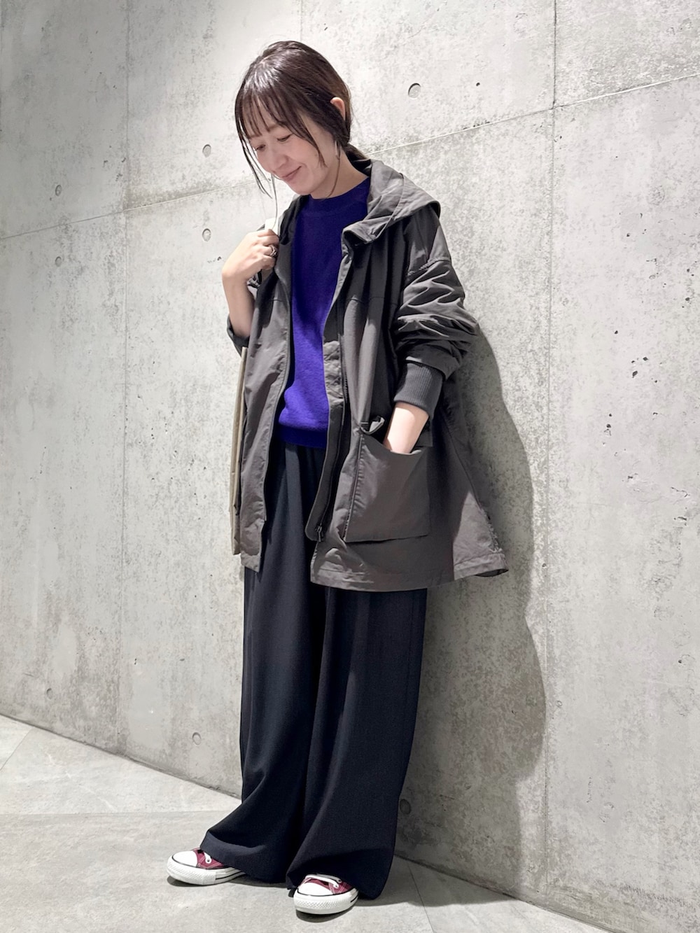 今回は、パープルのインナーニットをアクセントにした、大人カジュアルコーディネート。