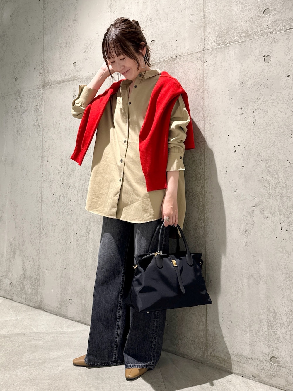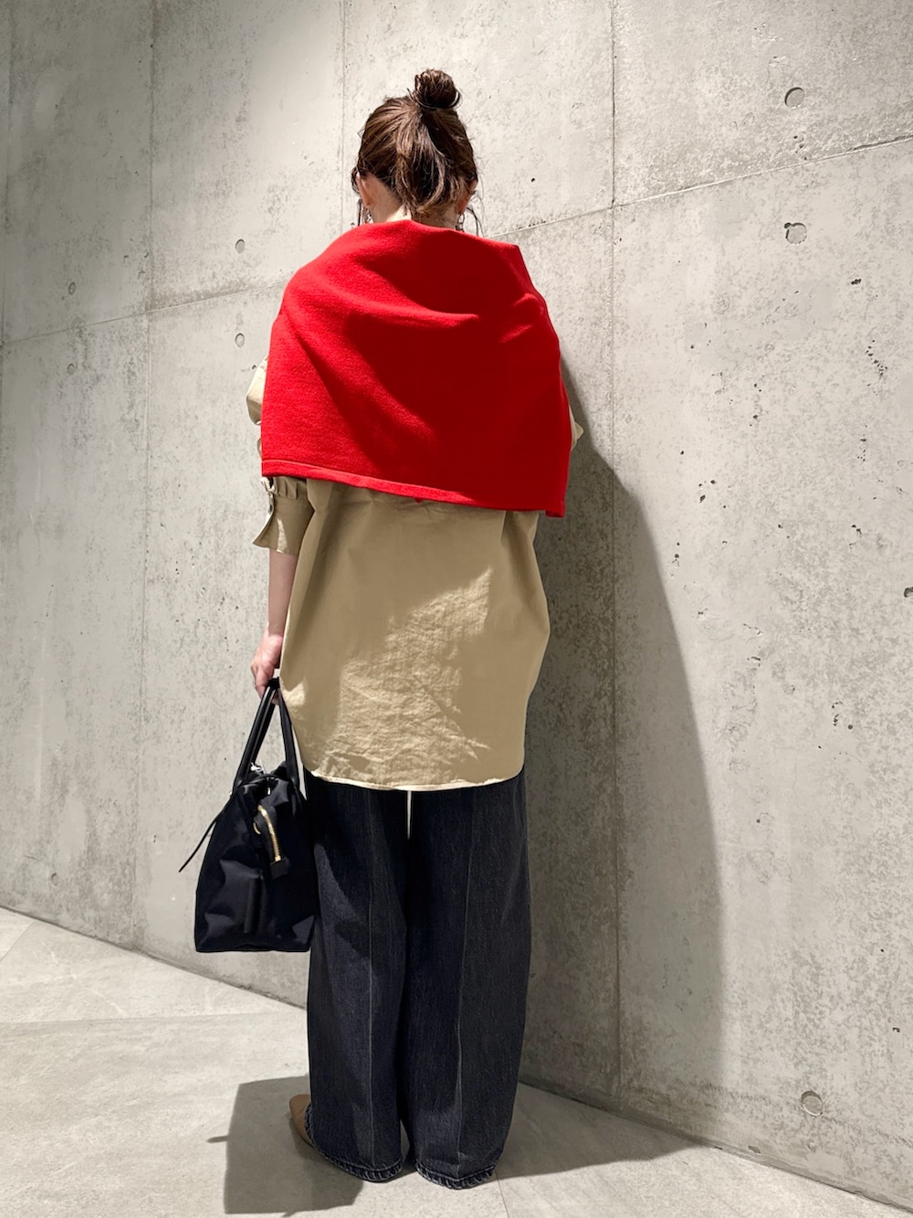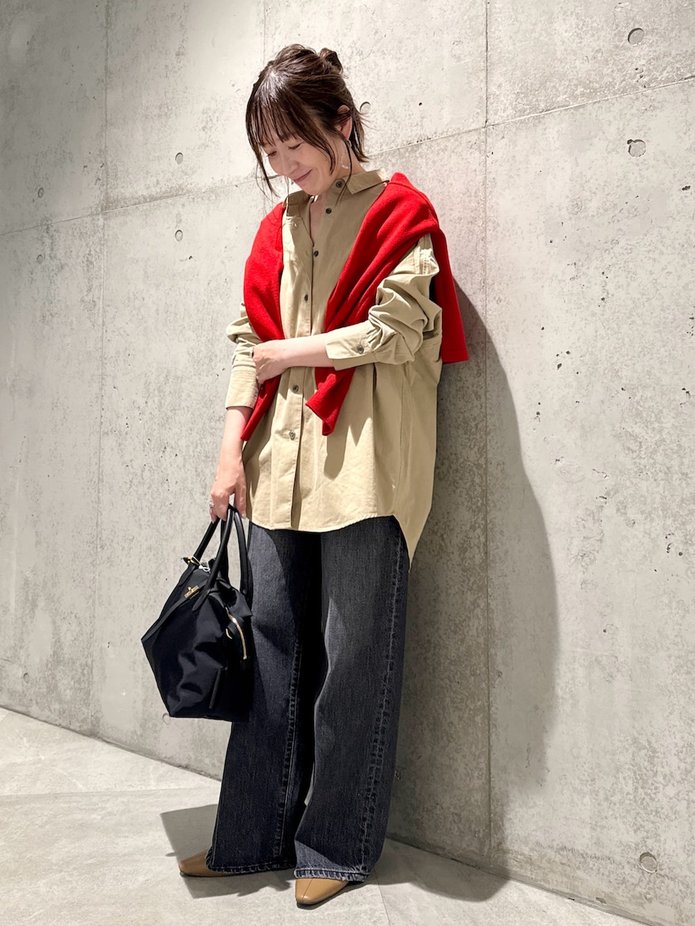今回は、ブラックデニムを合わせて、レッドカラーのカーディガンをアクセントにしてみました。