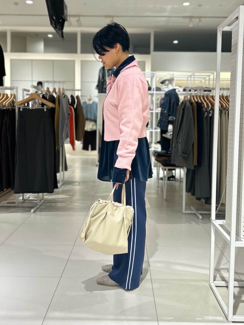 暗い色になりがちな秋冬服には、柔らかいピンクやオフホワイトを追加してみては?🙌
